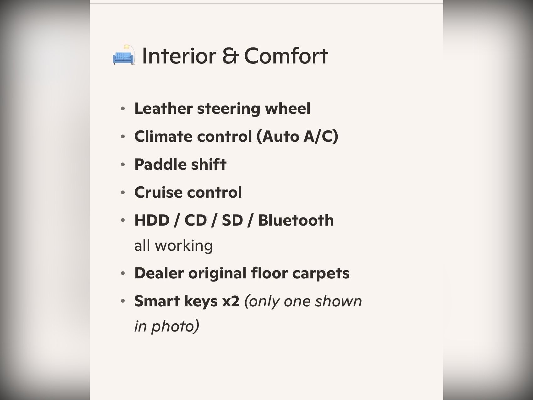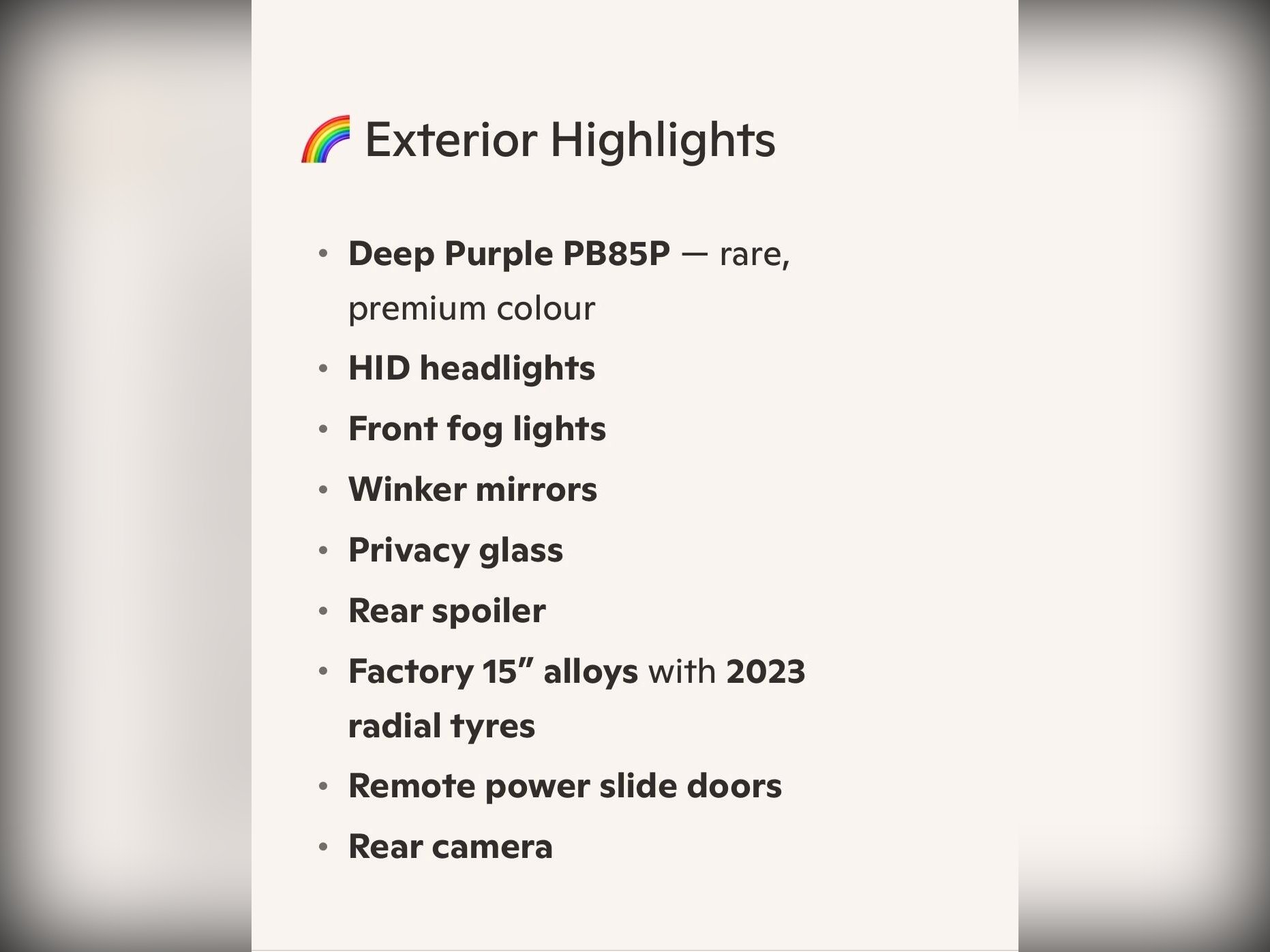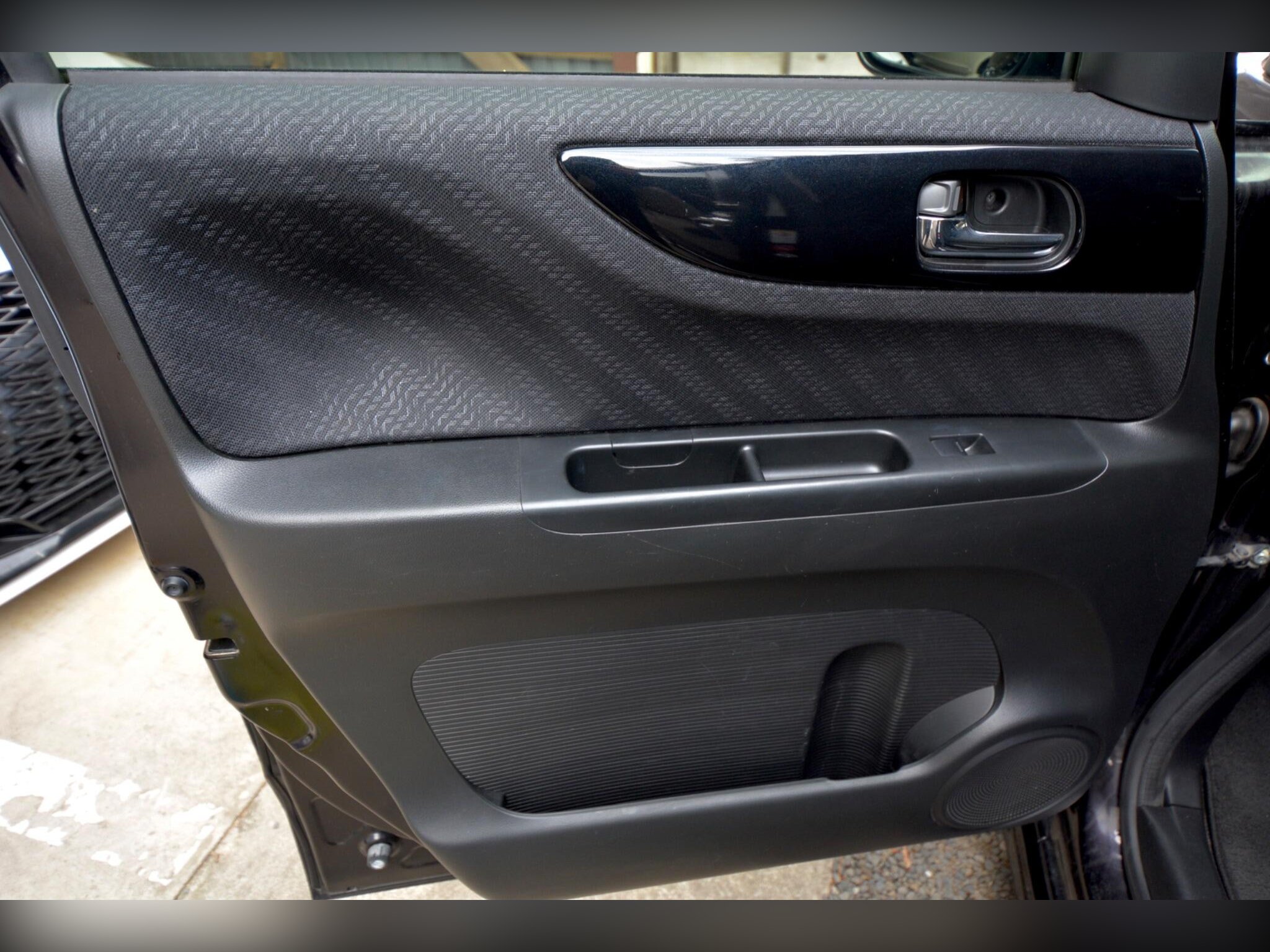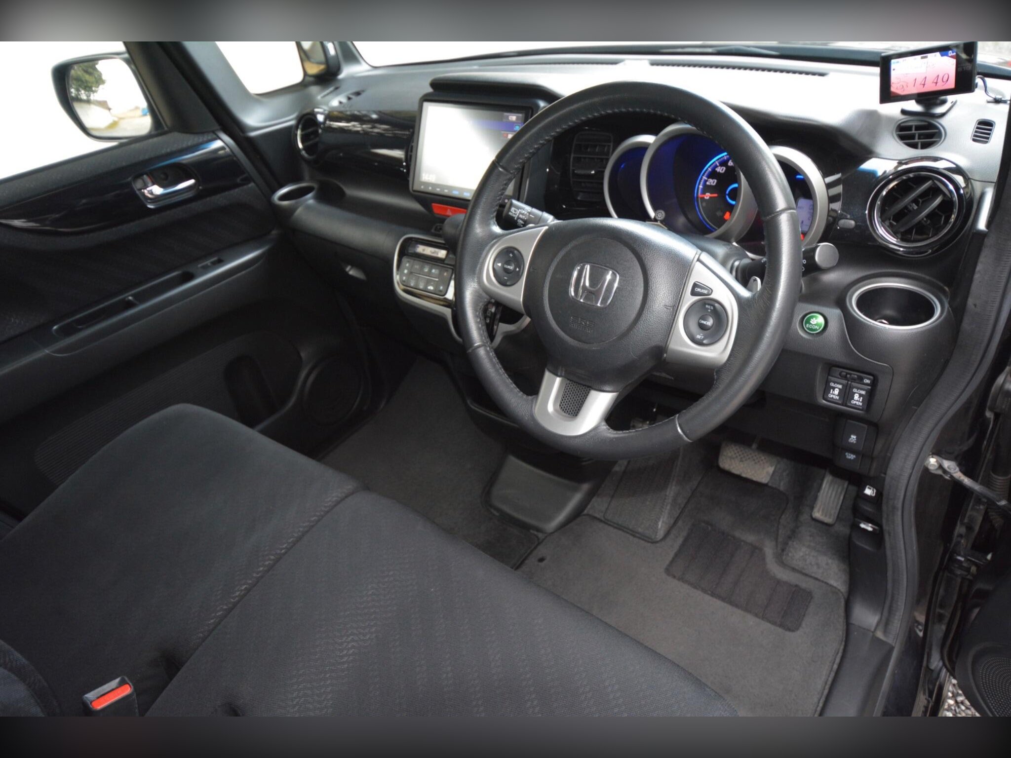 This high?spec model includes front fog lights, HID headlights, winker mirrors, privacy glass, rear spoiler, factory 15” alloy wheels with radial tyres, remote power slide doors and a rear camera. Inside you’ll find a leather steering wheel, climate control, cruise control, paddle shift, idle stop function, HDD/CD/SD/Bluetooth audio, dealer original floor carpets and two smart keys