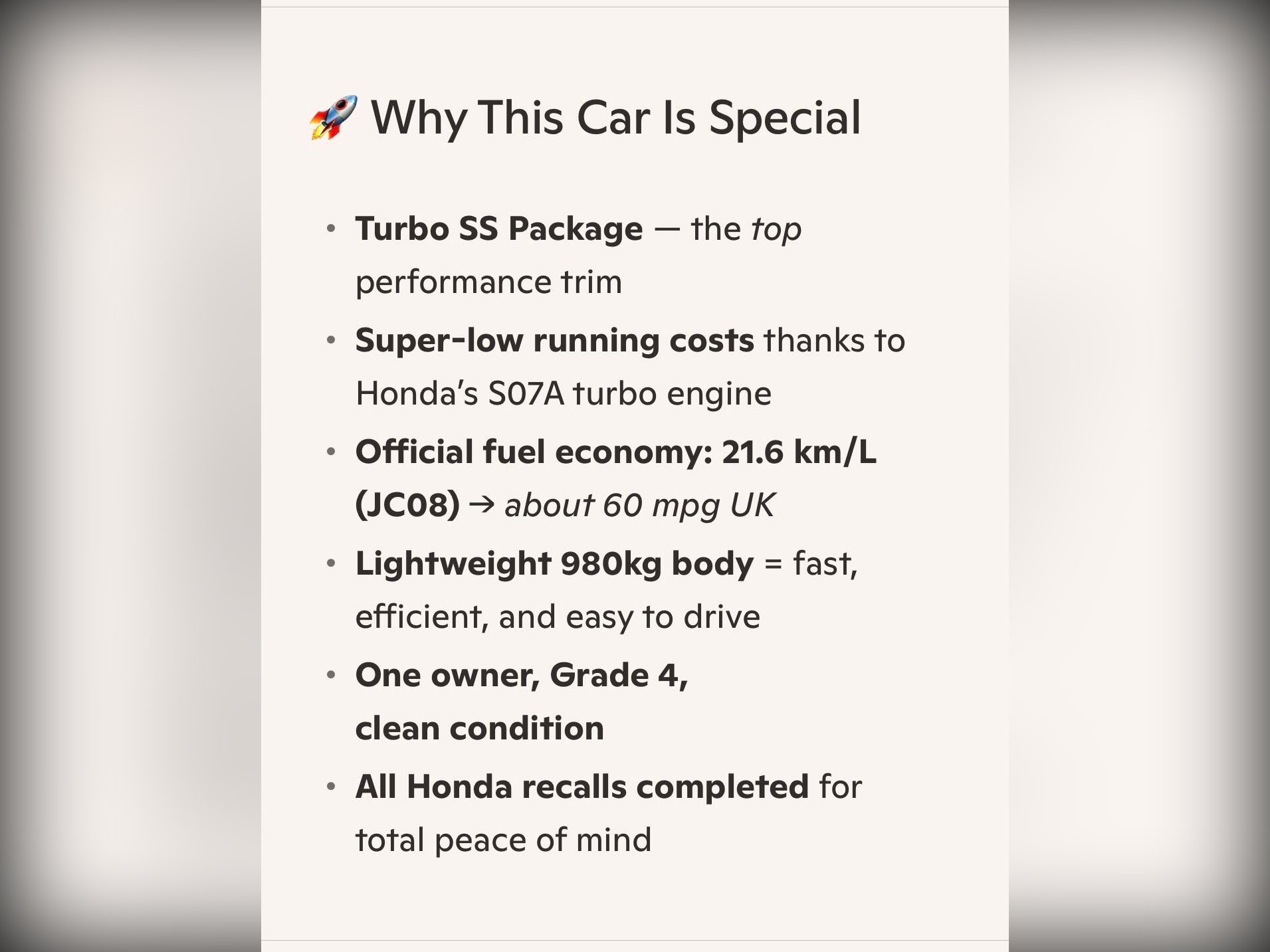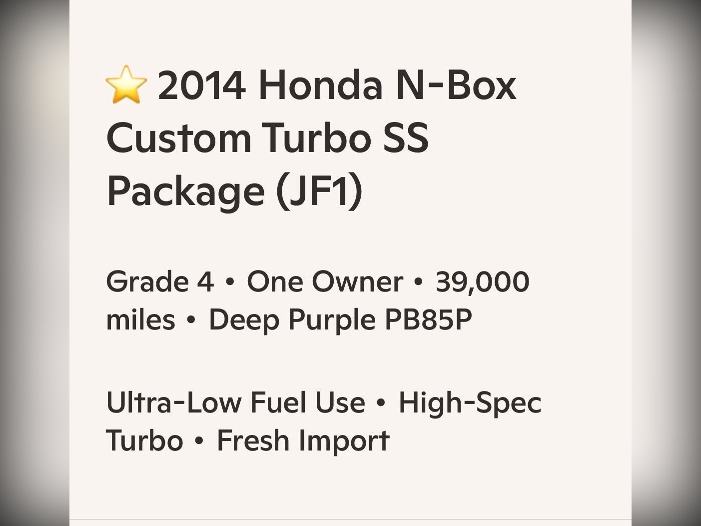A rare Turbo SS Package finished in Deep Purple PB85P, ( But looks Black) Grade 4, one?owner and freshly imported with Japanese service history. Ultra?clean condition throughout with all Honda maker recalls completed. Powered by the efficient 660cc turbo engine with an automatic gearbox delivering smooth, seamless acceleration.