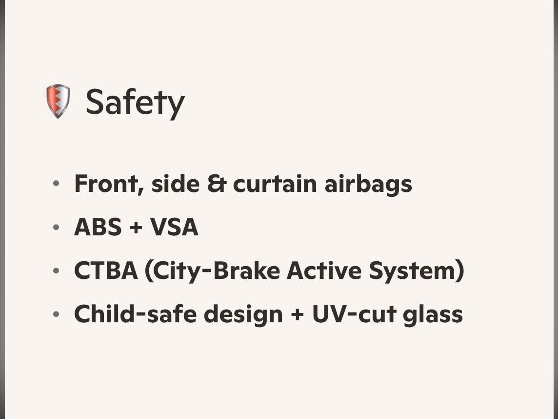 Safety features include front, side and curtain airbags, ABS, traction control, CTBA City?Brake Active System and stability assist.
