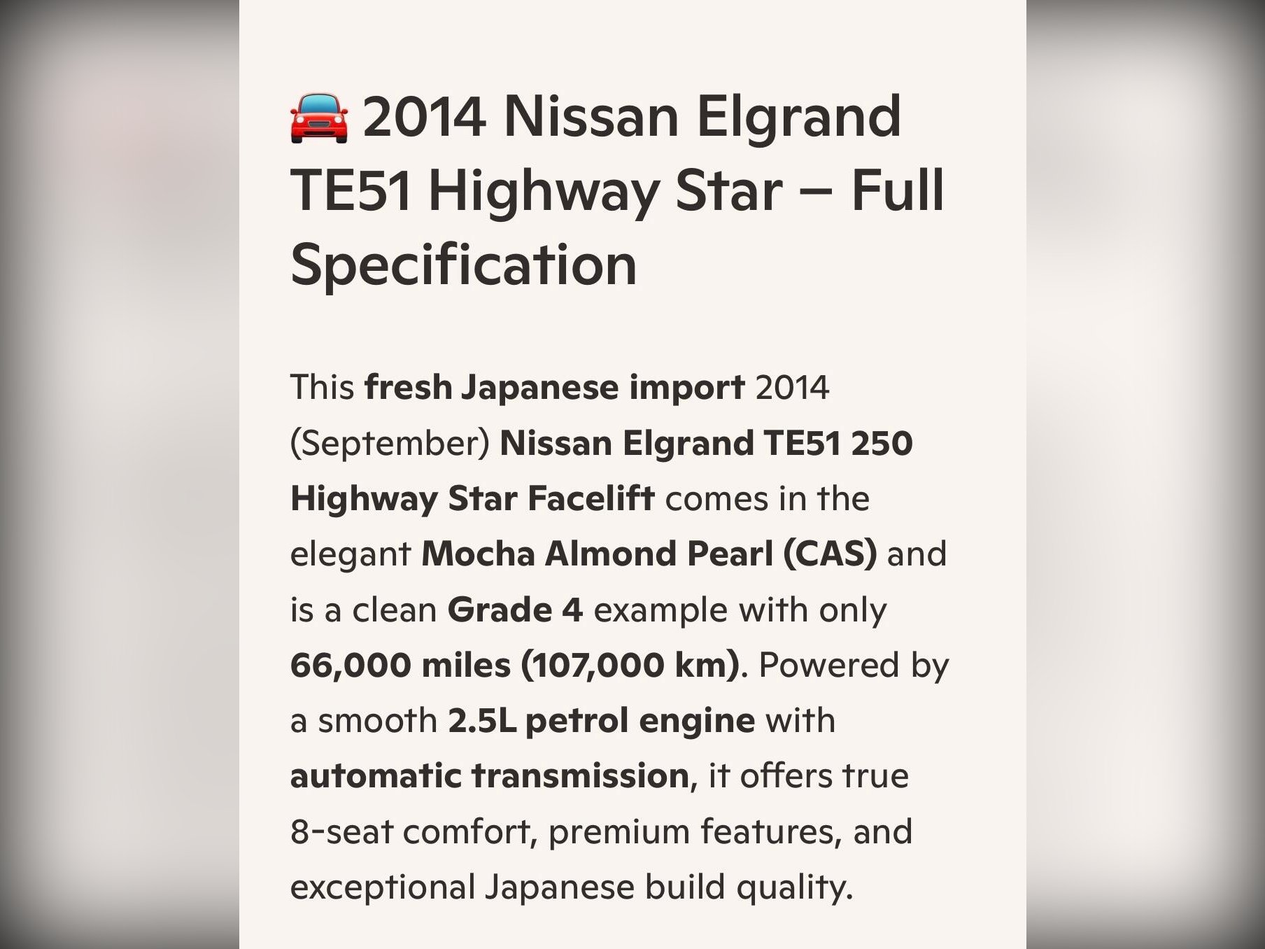 A beautifully presented fresh Japanese import finished in Mocha Almond Pearl (CAS). This clean Grade 4 2014 (September) Nissan Elgrand TE51 Highway Star comes with the smooth 2500cc petrol engine, automatic gearbox, and genuine 8?seat layout. Covered only 66,000 miles (107,000 km) and drives exactly as it should.