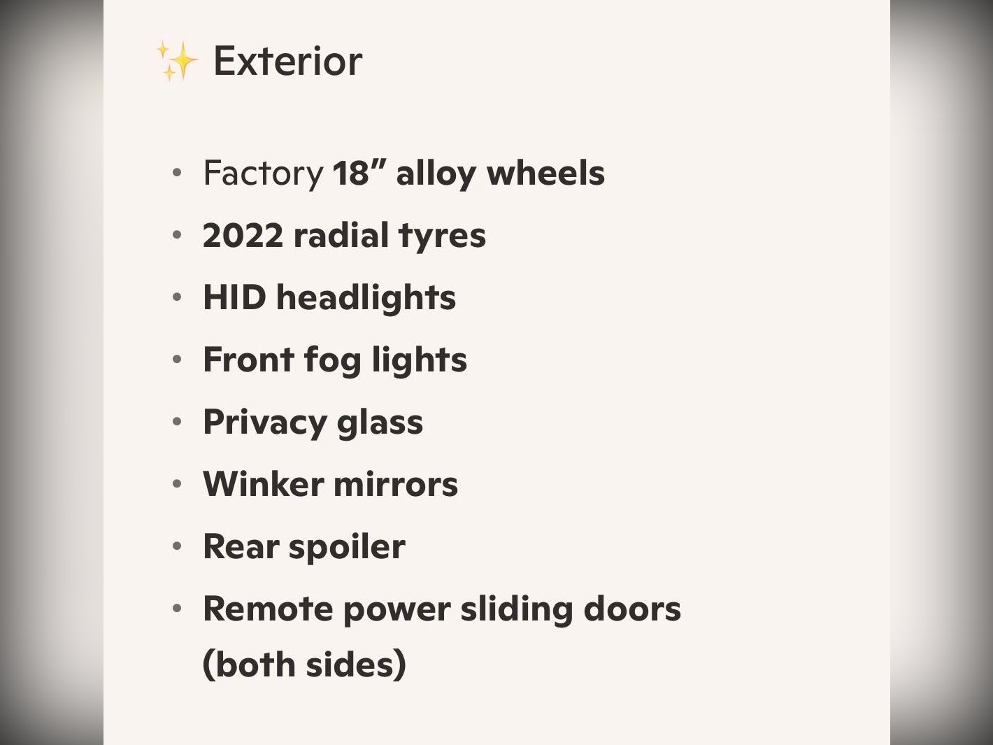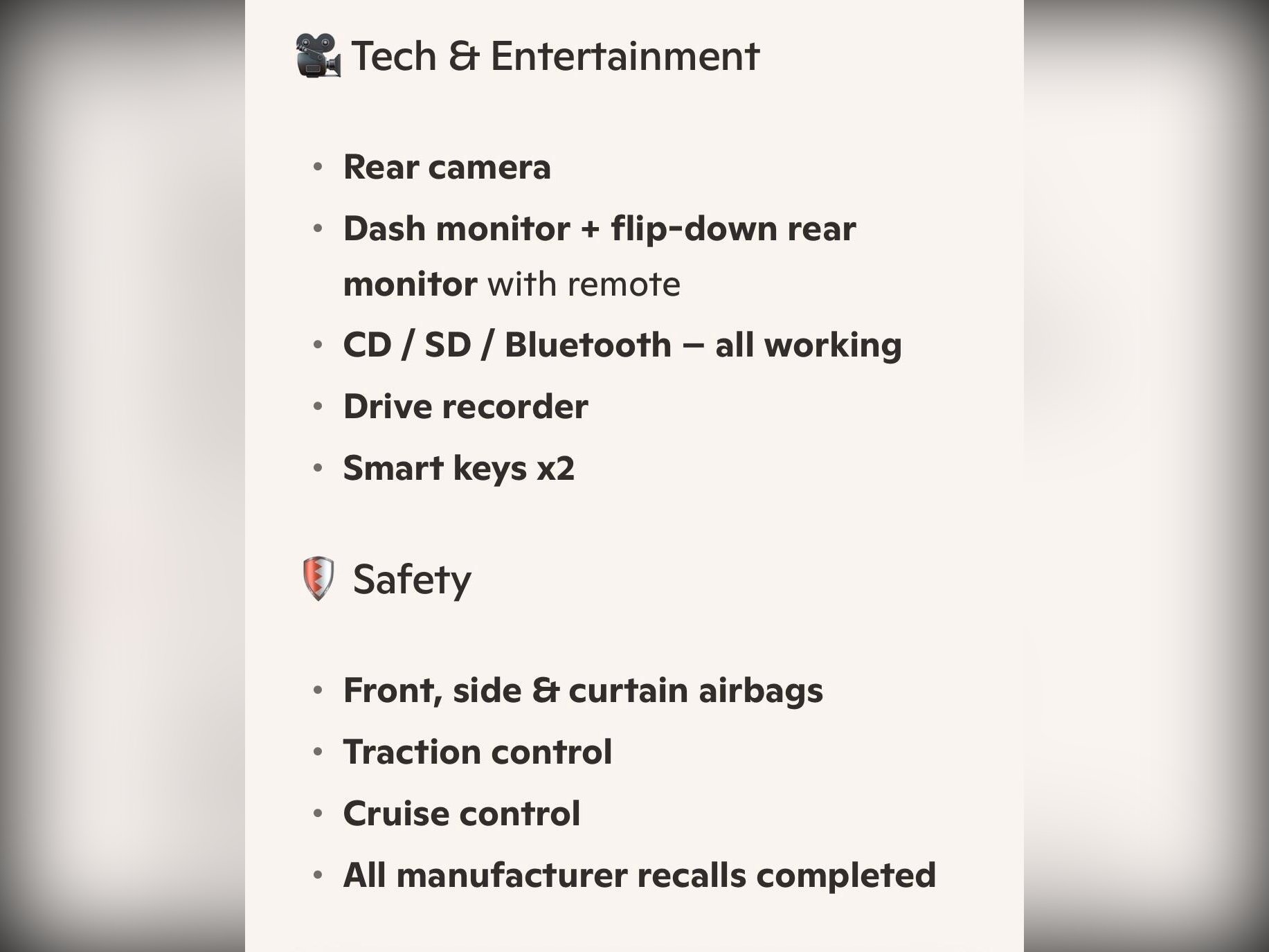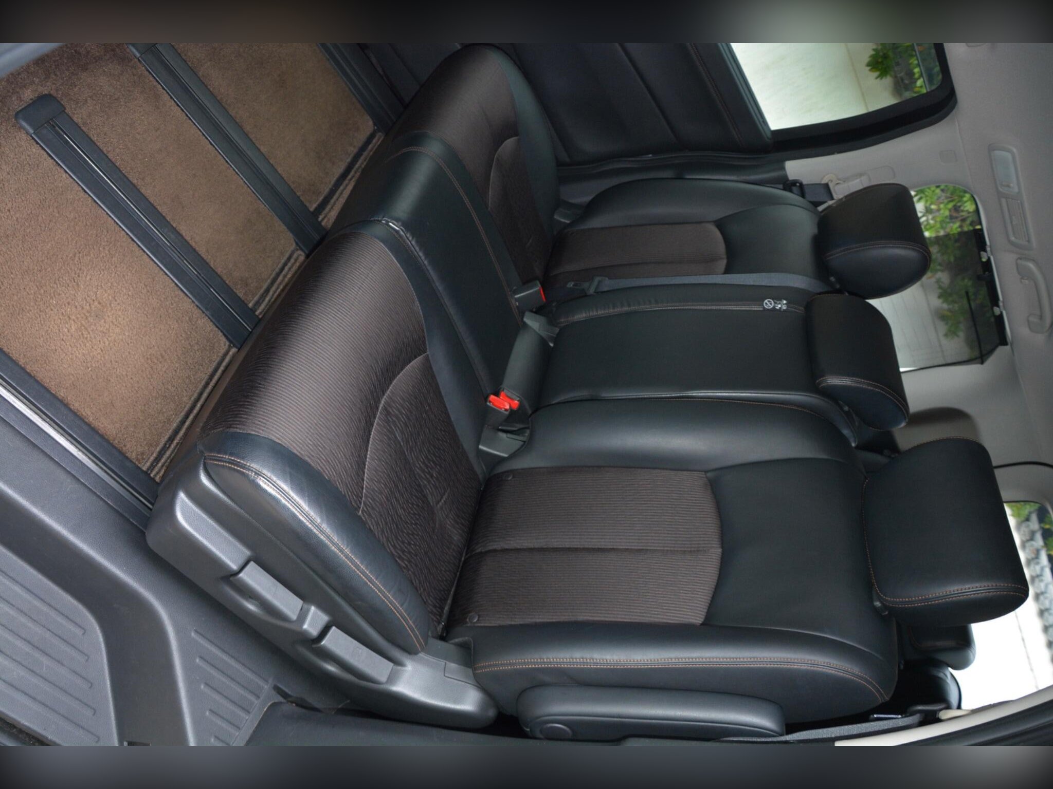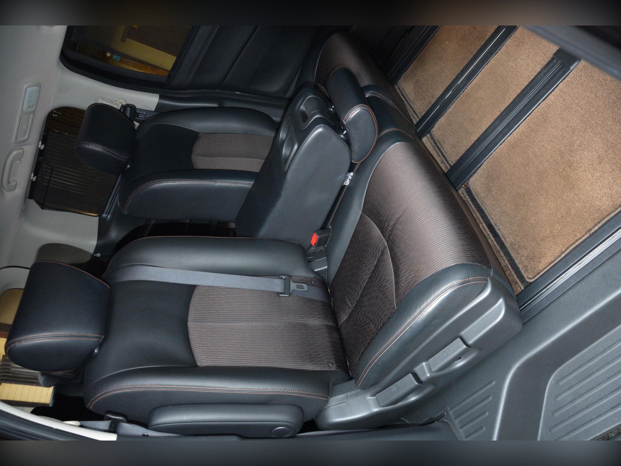 This example features front fog lights, HID headlights, privacy glass, winker mirrors, rear spoiler, remote power sliding doors, factory 18” alloy wheels with 2022 radial tyres. Inside you get half leather seats, leather steering wheel, climate control, pull?up sunshades on 4 rear windows, dealer original floor carpets and rear boot area board. Technology includes rear camera, dash monitor, flip?down rear monitor with remote, CD/SD/Bluetooth (all working), drive recorder and smart keys (x2). Safety features include traction control, cruise control, and front, side and curtain airbags. All maker recalls have been completed.