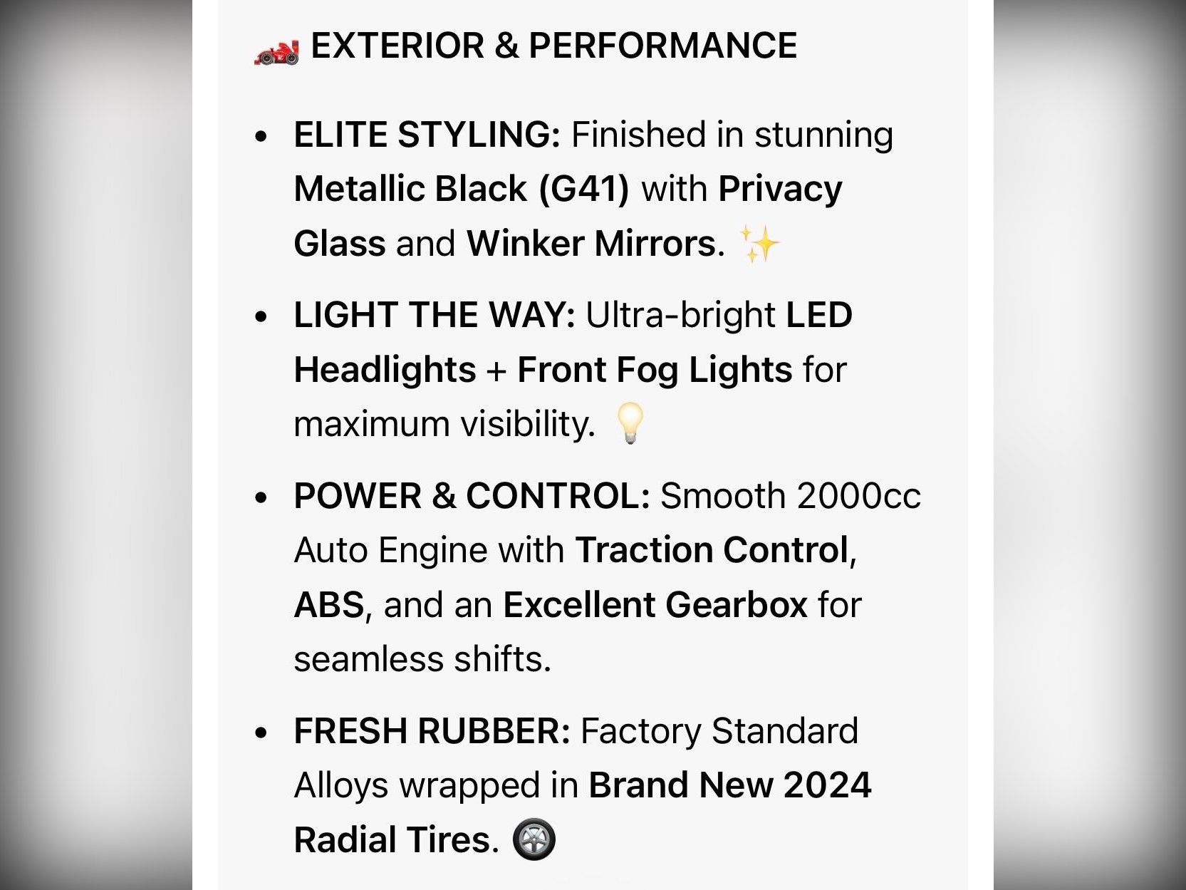 • NEW RUBBER: Factory alloys fitted with brand-new 2024 Radial Tires.