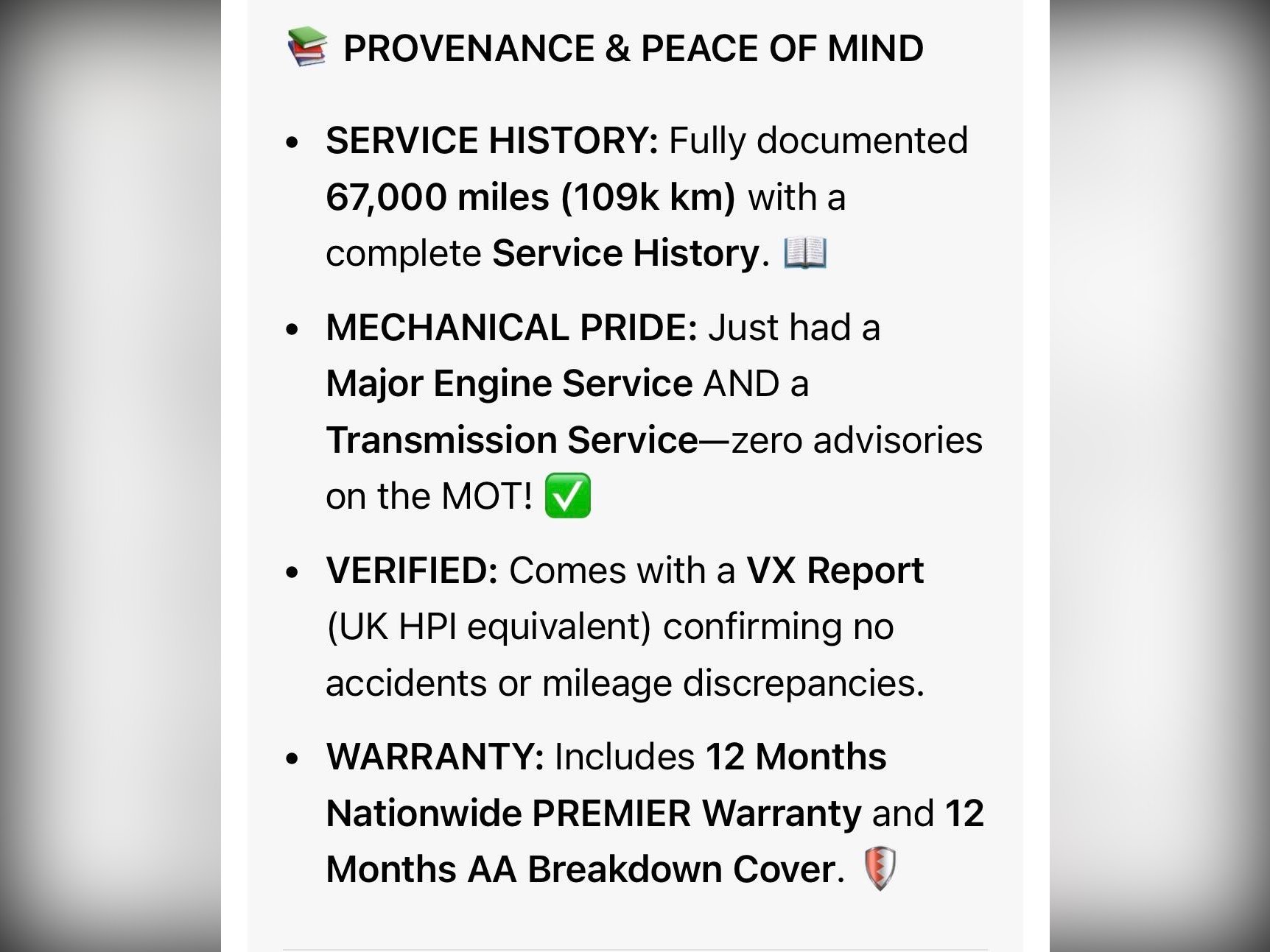 ? Verified VX/HPI Report (Confirms zero mileage discrepancies or hidden accidents).