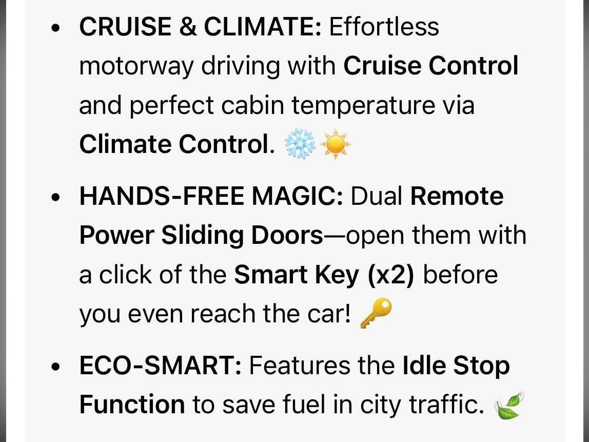• CONVENIENCE: Remote Dual Power Slide Doors, Smart Keys (x2), Climate Control, and Idle Stop function.