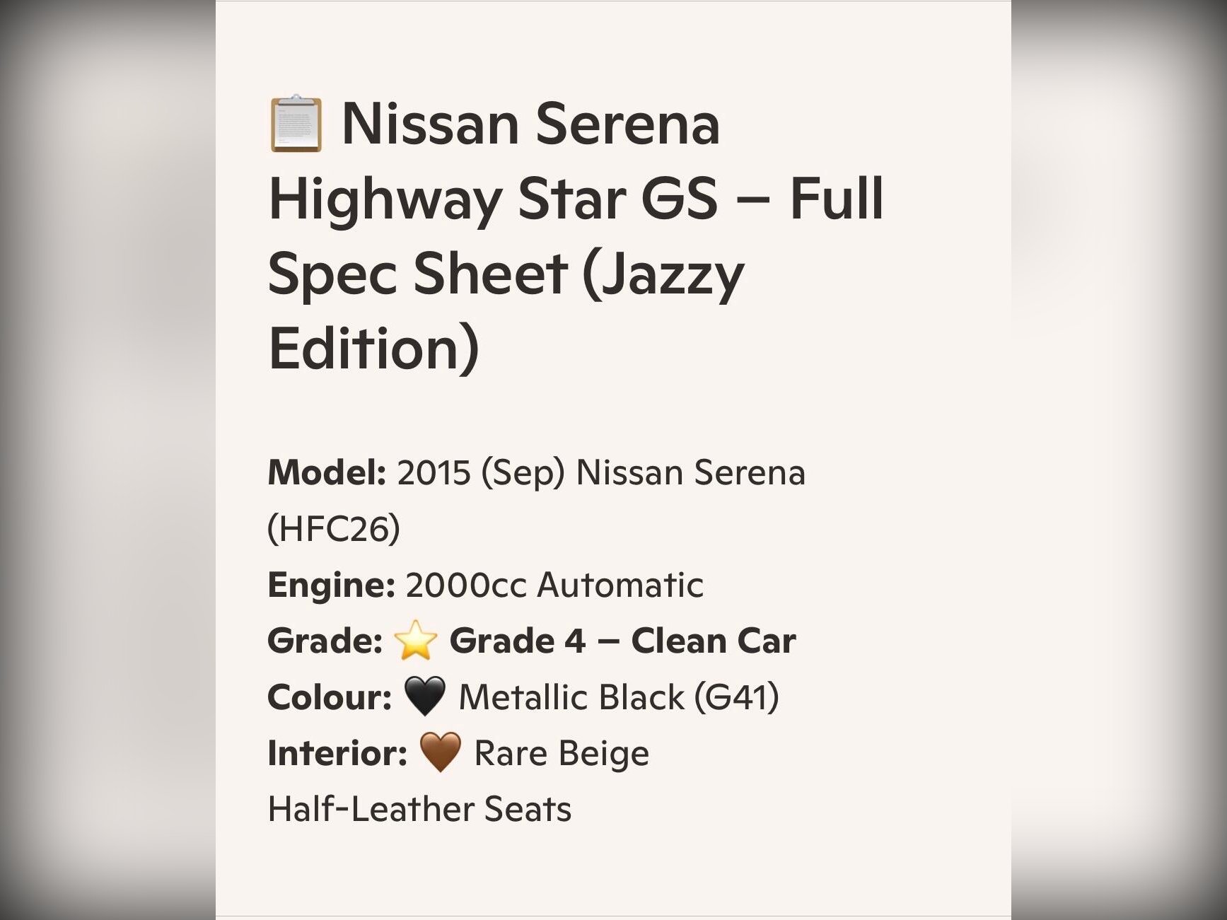 The moment this 2015 (Sep) Nissan Serena Highway Star GS (HFC26) arrived in our showroom, it stood out instantly. Finished in deep Metallic Black (G41) and paired with the rare beige half?leather interior, it’s the kind of example that reminds you why Japanese MPVs have such a loyal following. A genuine Grade 4 clean car, it presents beautifully, with LED headlights, front fog lights, winker mirrors, privacy glass, and factory alloy wheels wrapped in 2022 radial tyres.