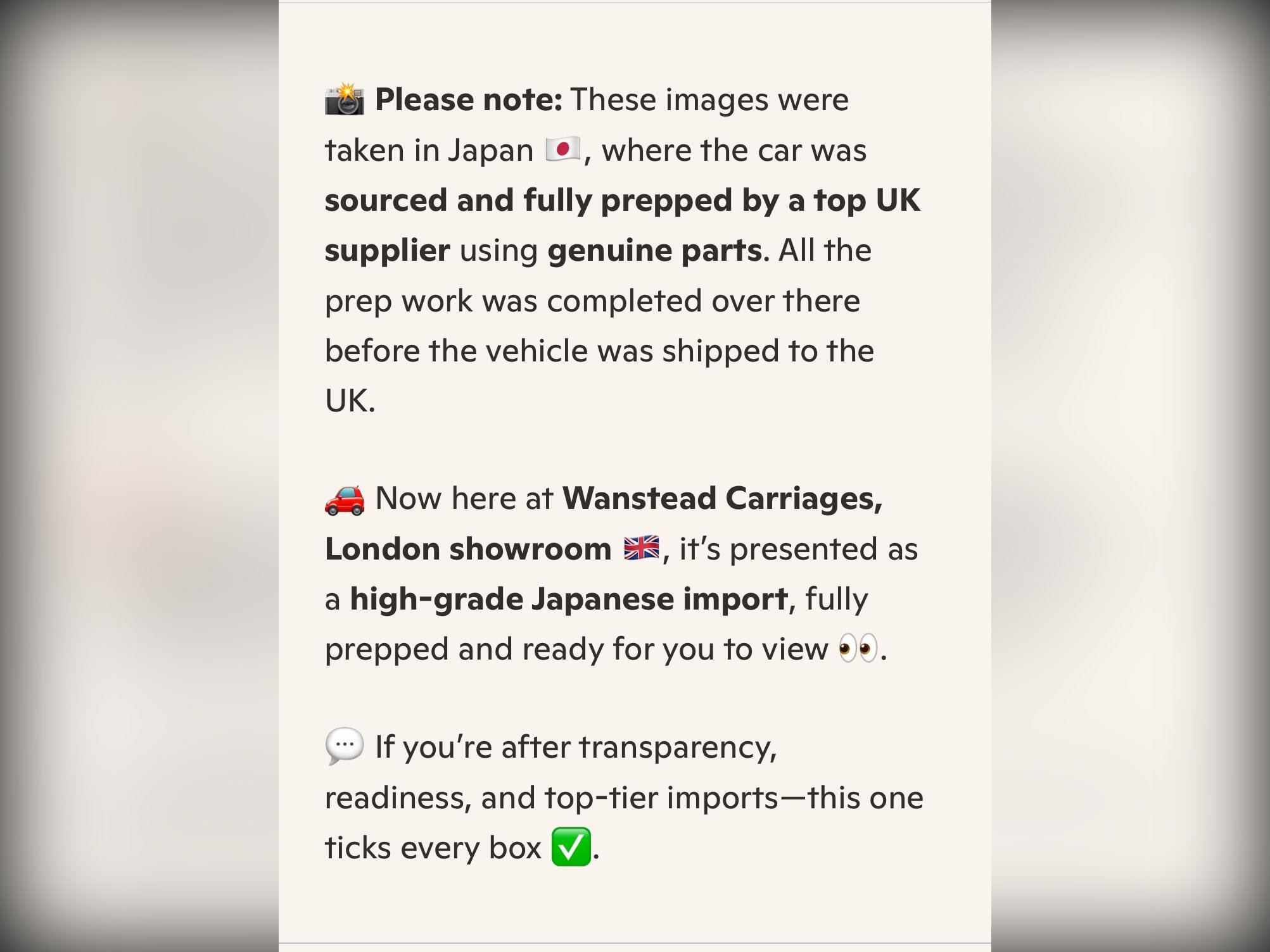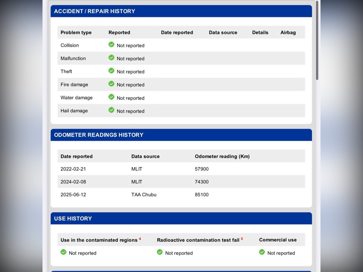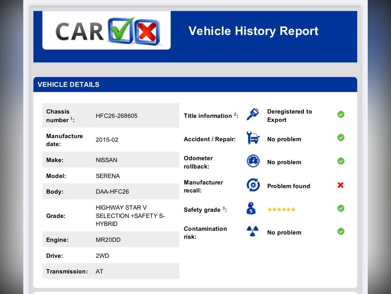 • VX Report – confirms auction grade, mileage, ownership history, and condition direct from Japan