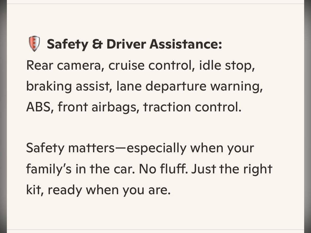 • ? Idle Stop, Braking Assist, Lane Departure Warning, Traction Control, ABS – advanced safety suite