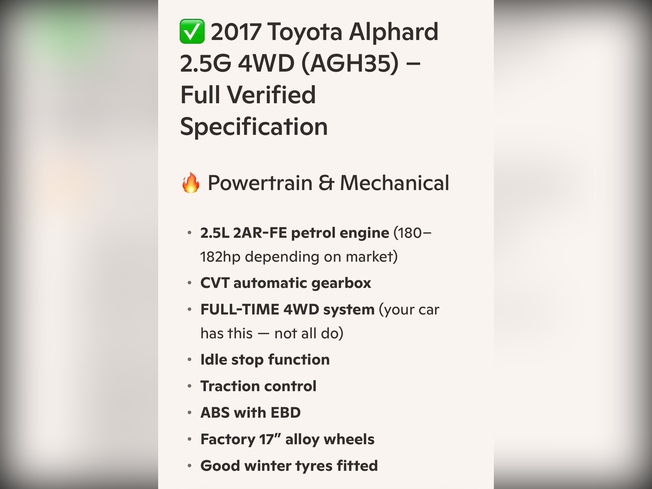 This 2017 (Nov) Toyota Alphard 2.5G 4WD (AGH35) is presented in exceptional condition and finished in Pearl White (086). A rare full-time 4WD model, it offers outstanding stability and confidence on all road surfaces, making it an ideal choice for UK driving conditions. This example also features the highly desirable full Modellista aero kit, giving the vehicle a premium, distinctive appearance that sets it apart from standard models. The specification includes LED headlights, front fog lights, winker mirrors, privacy glass, rear spoiler, factory 17-inch alloy wheels with good tyres, remote power slide doors on both sides, and a remote power rear gate. Inside, it offers half-leather beige seats, a 7-seat layout with captain seats, a power-assisted driver seat with memory function, pull-up rear window shades, dual climate control with Nanoe air purification, dealer original floor carpets, and a clean, non-smoker interior. Driver assistance features include Speed Adaptive Radar Cruise Control, PCS, Intelligent Clearance Sonar, ABS, traction control, auto wipers, and auto-folding mirrors. Technology includes CD, SD and Bluetooth connectivity, smart keys (x2), and idle stop function. The vehicle has covered 61,000 miles (99,000 km) and has had all manufacturer recalls completed. It has just received a fresh MOT, engine service and transmission service with no advisories. A verified VX report (equivalent to UK HPI) confirms no mileage discrepancies or hidden accidents, and a certificate will be provided. The vehicle drives beautifully with no warning lights, and the automatic gearbox performs smoothly with seamless gear changes. The price includes a 12?month nationwide comprehensive Premier warranty covering over 8,000 mechanical and electrical components, plus 12 months AA breakdown cover. All vehicles undergo a rigorous multi?point pre?delivery inspection, and AA/RAC inspections are welcome. Wanstead Carriages is proud to operate under AA Cars Standards, approved by the Chartered Trading Standards Institute, ensuring complete confidence in your purchase.