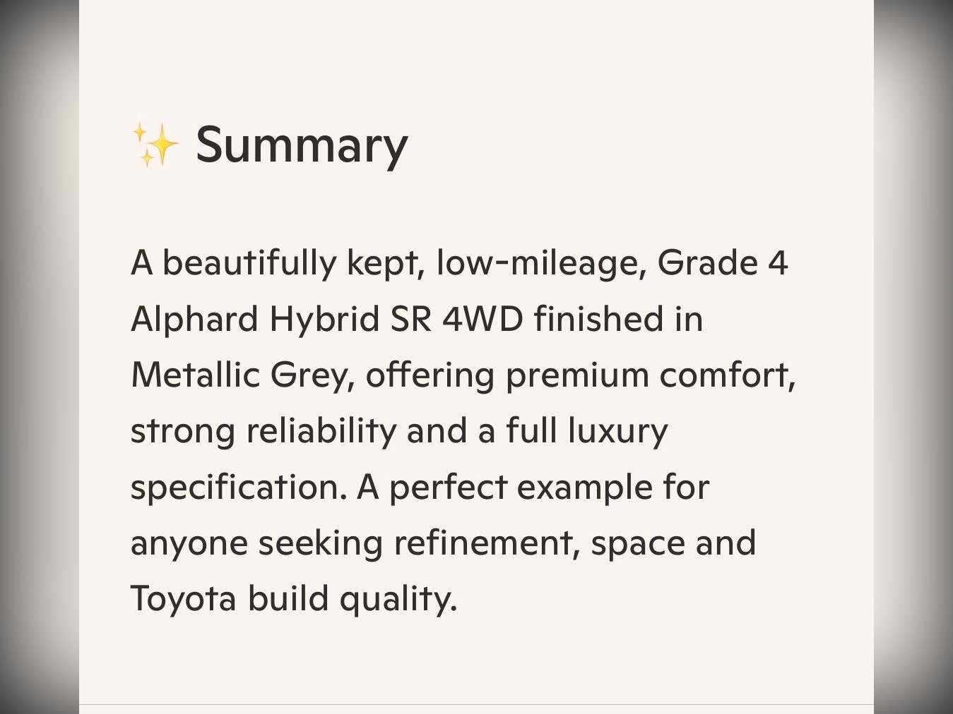 An outstanding, high-grade example of the Toyota Alphard Hybrid SR, finished in the sophisticated and easy-to-maintain Metallic Grey (1E4). This fresh import combines the luxury of a premium MPV with the efficiency of a self-charging hybrid and the safety of Toyota’s E-Four 4WD system.