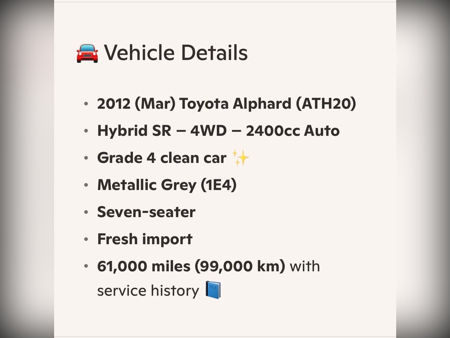 2012 (12) Toyota Alphard 2.4 Hybrid SR 4WD • Grade 4 • 61k Miles