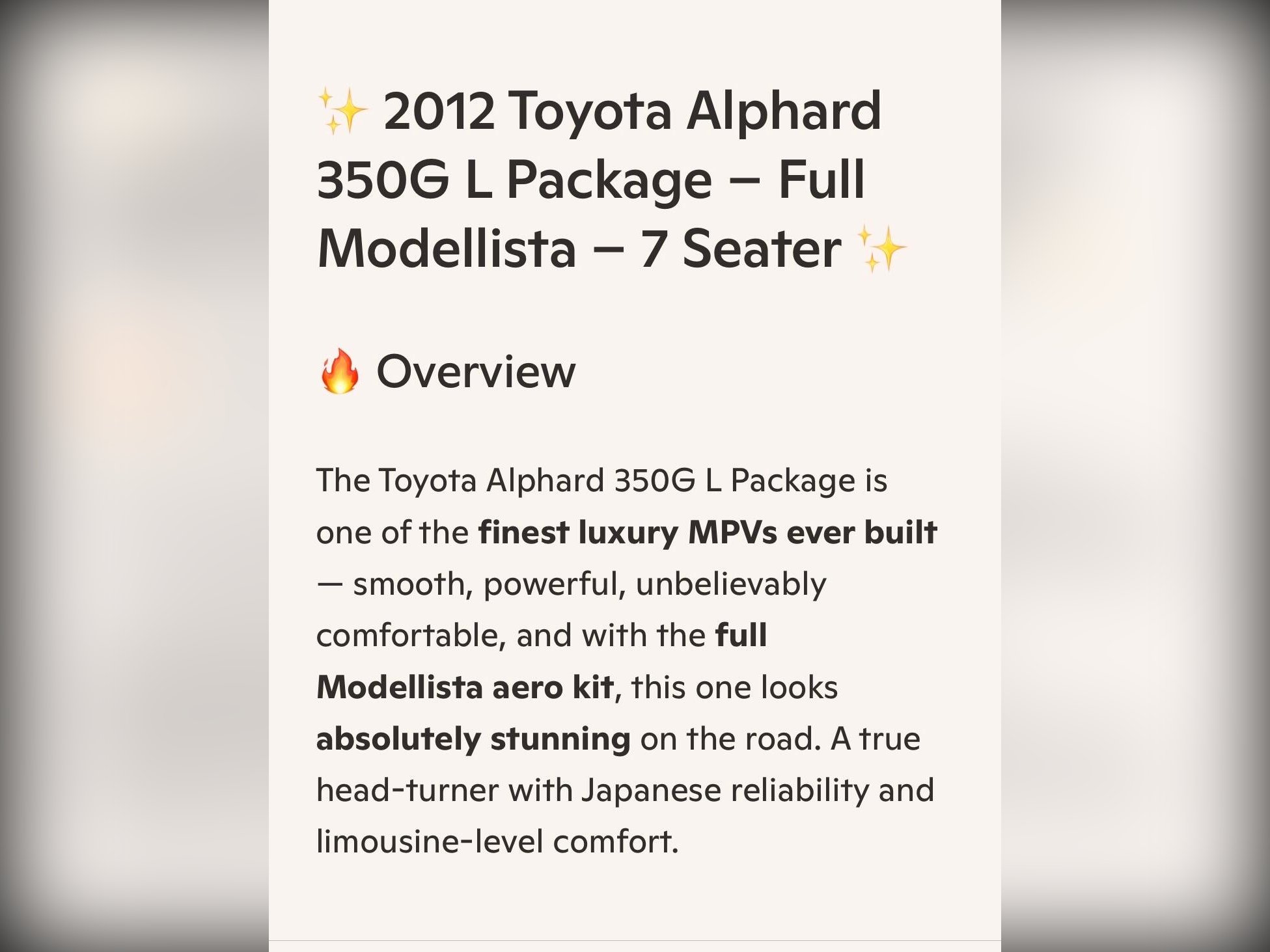 A beautifully presented Grade 4 Toyota Alphard 350G L Package finished in Metallic Black (202) and enhanced with the full Modellista aero kit and grille, giving this example a far more premium and commanding road presence than standard models. A clean, non?smoker vehicle with excellent condition throughout and the smooth 3.5 V6 engine.