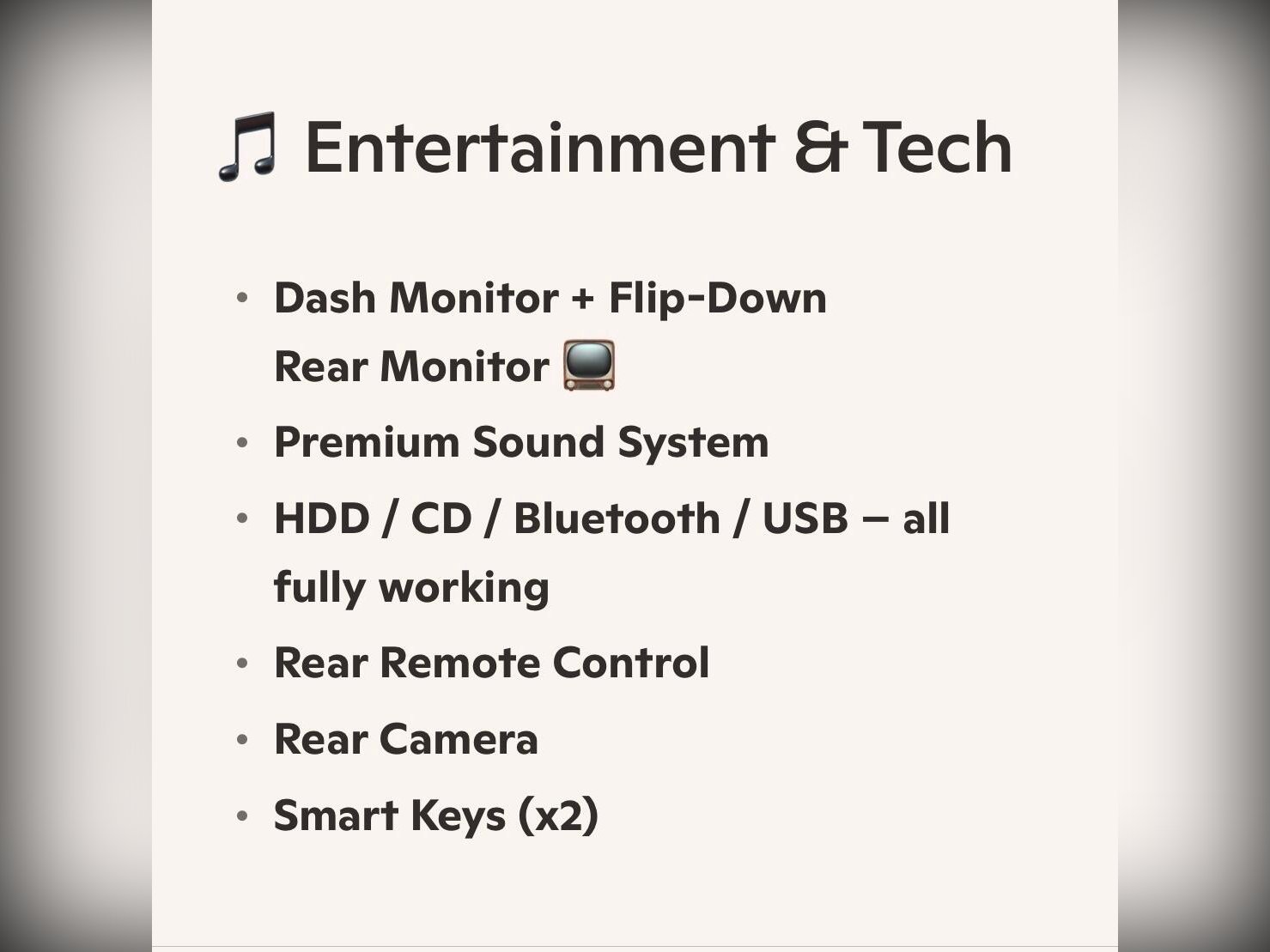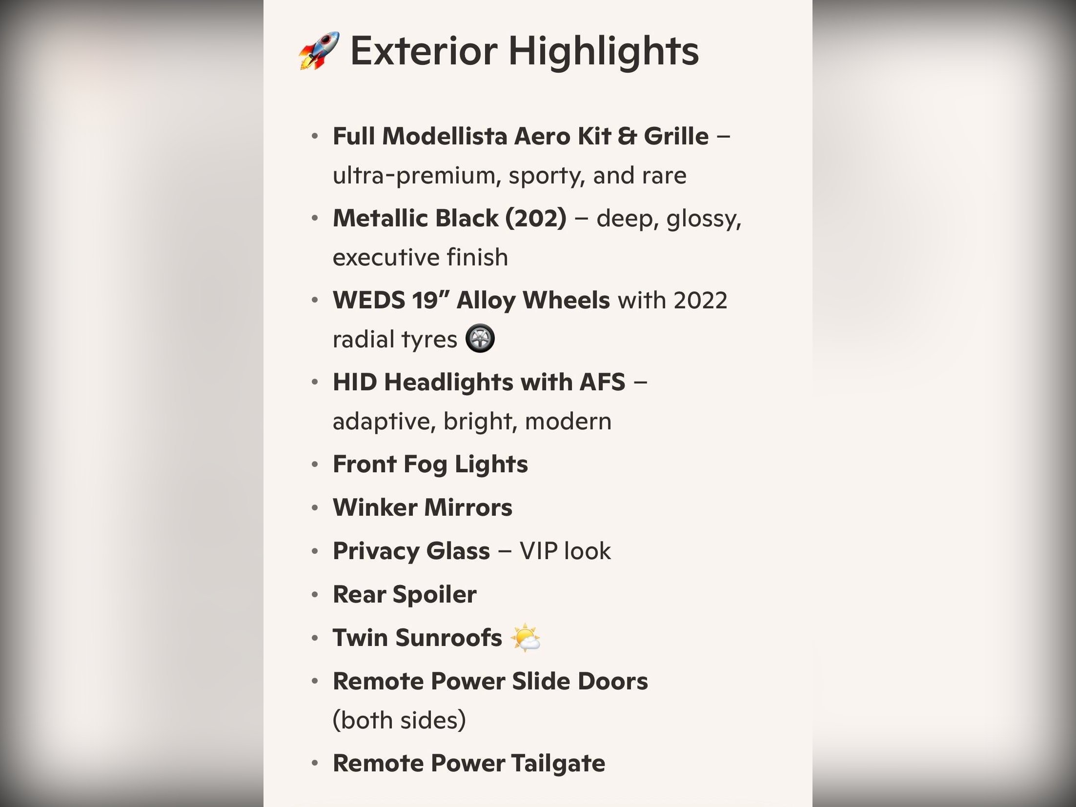 Exterior features include WEDS 19” alloy wheels with 2022 tyres, HID headlights with AFS, front fog lights, winker mirrors, privacy glass, rear spoiler, and remote power slide doors and power tailgate. Smart keys (x2), all?round parking sensors, rear camera, cruise control, climate control, auto folding mirrors, auto wipers and auto dipping headlights complete the high specification.