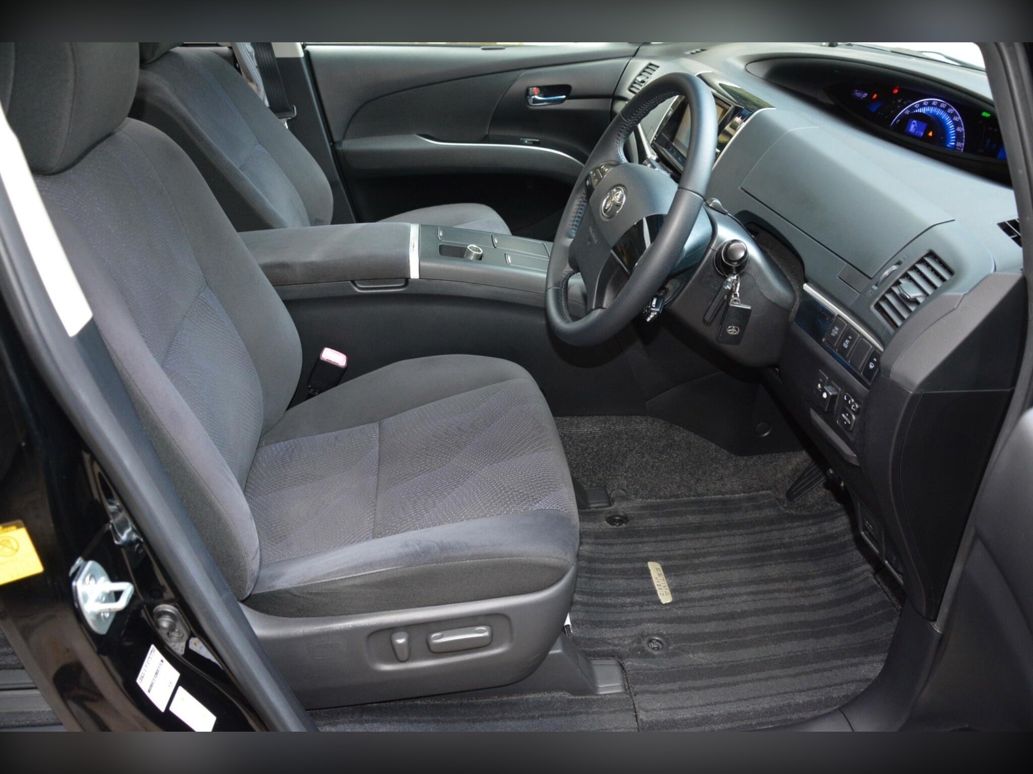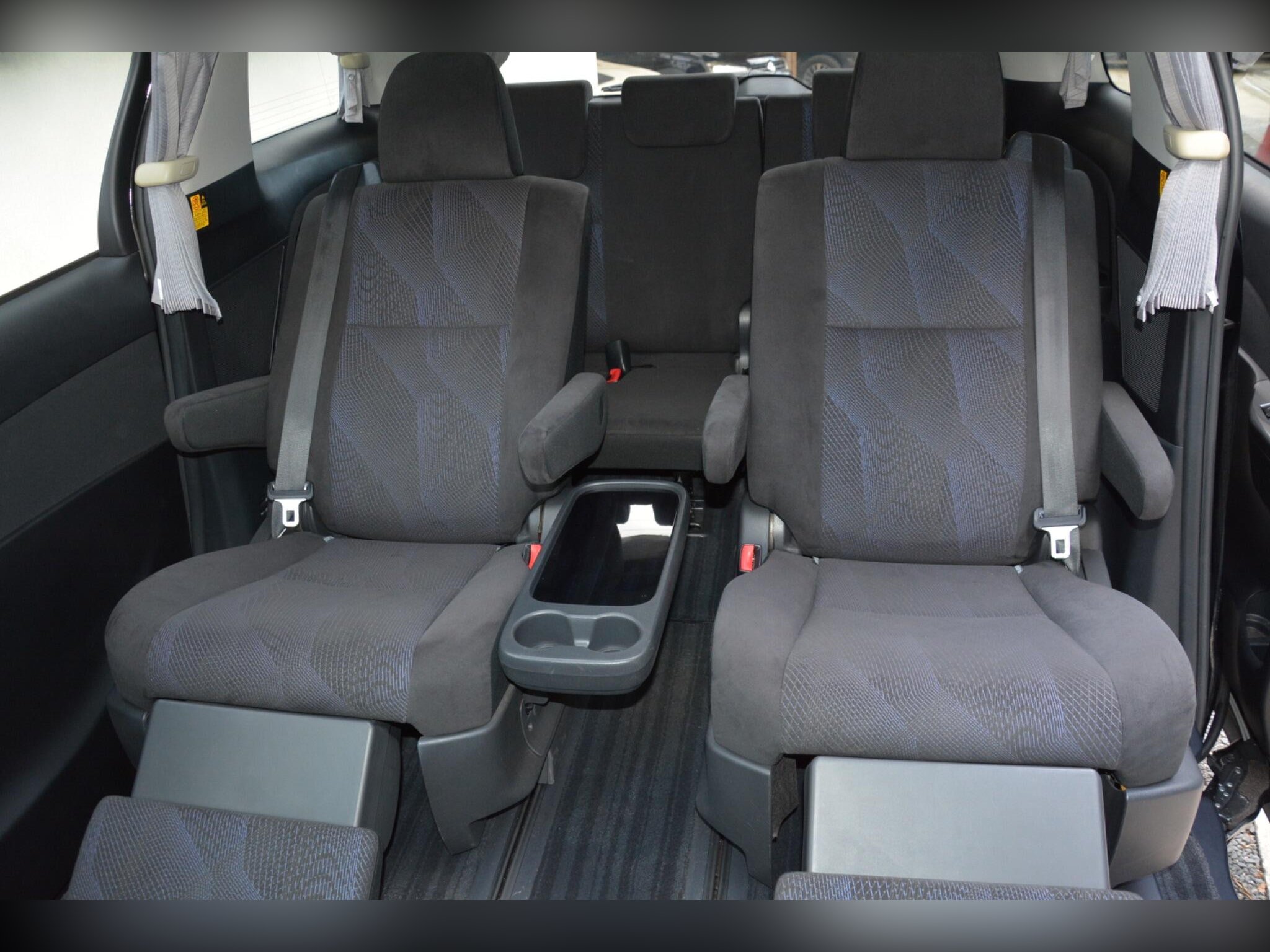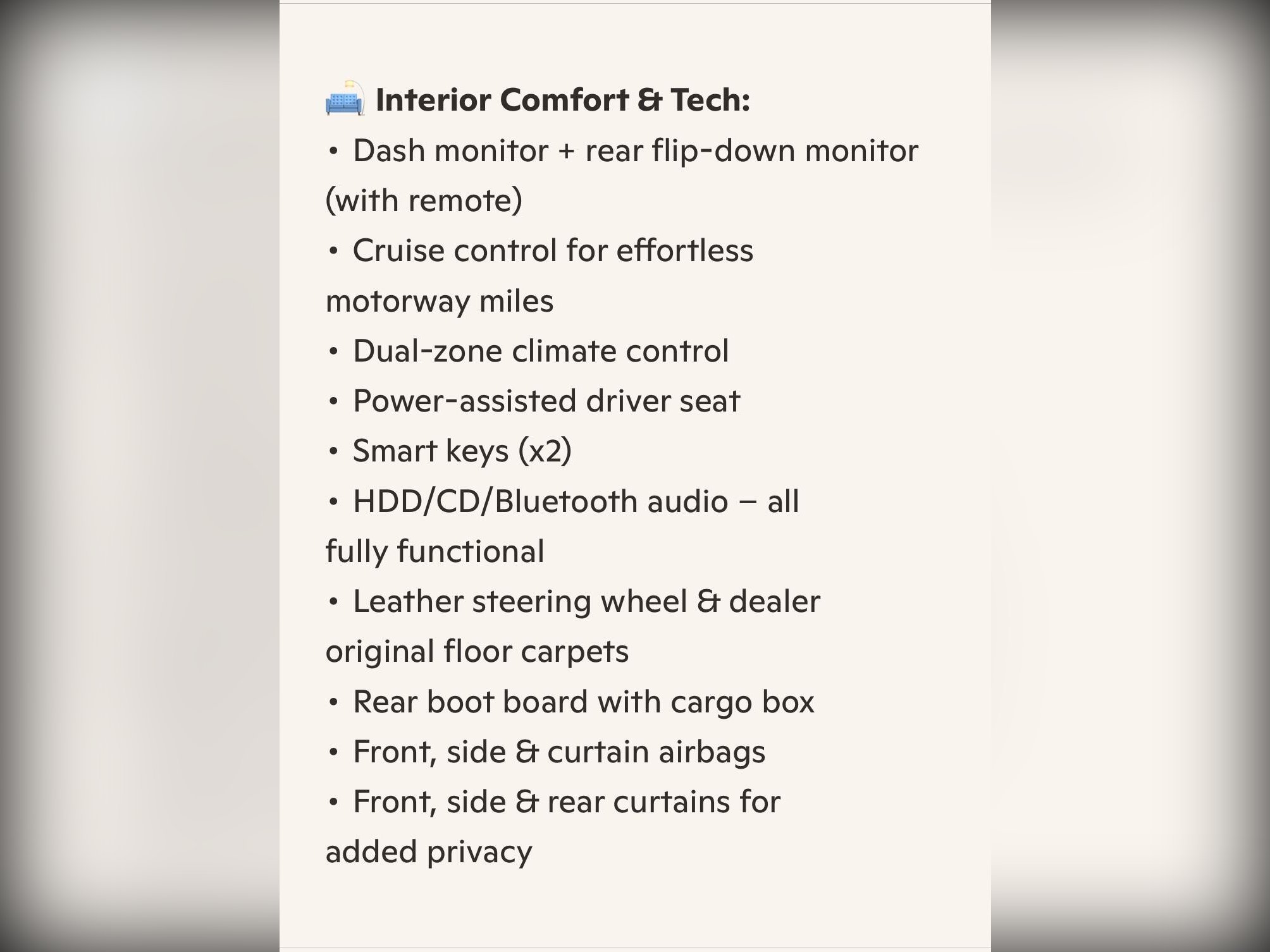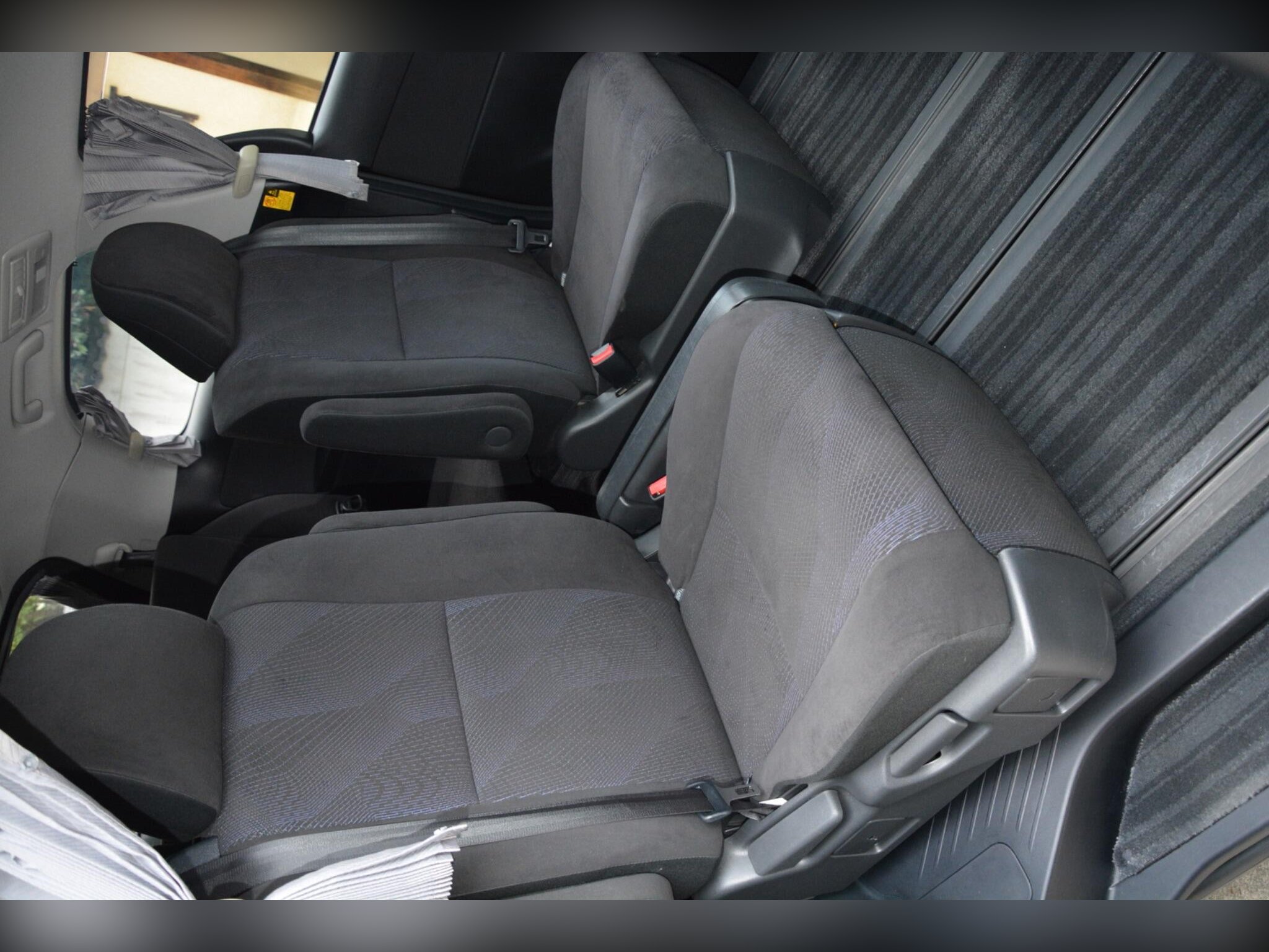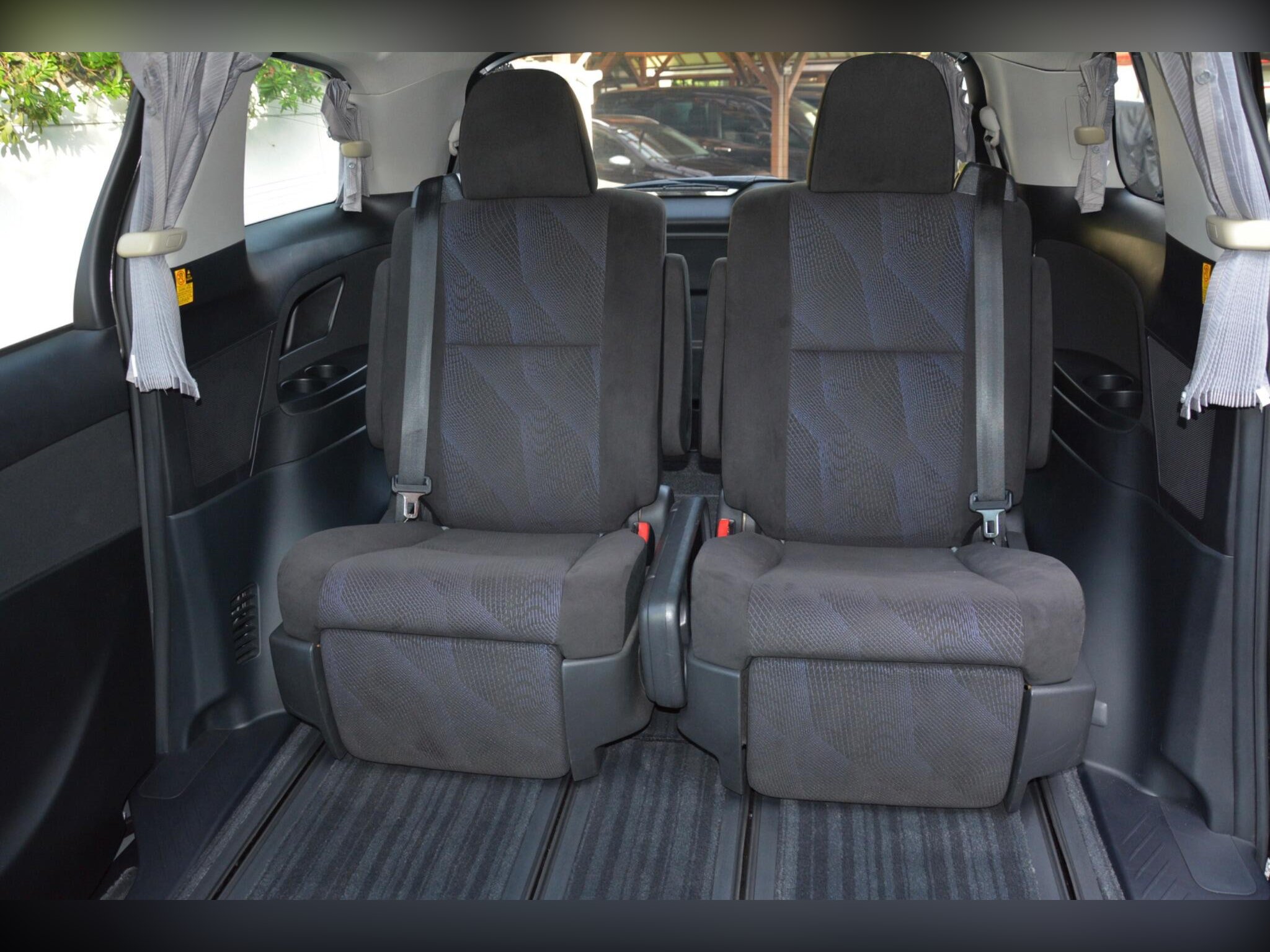 Remote power slide doors, dash monitor and flip-down rear monitor with remote. Cruise control, dual-zone climate control, traction control. Power-assisted driver seat, leather steering wheel, dealer original floor carpets. Rear boot board with cargo box. HDD/CD/Bluetooth audio system. Front, side and curtain airbags. Front, side and rear curtains.
