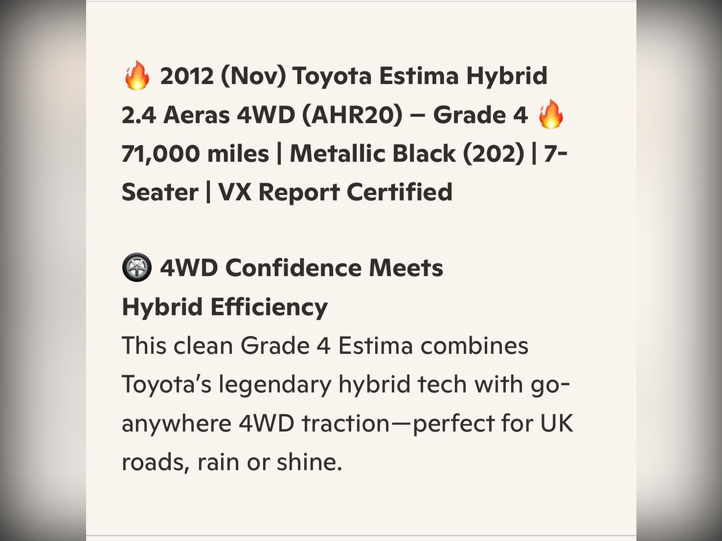 2012 (Nov) Toyota Estima Hybrid 2.4 Aeras 4WD (AHR20) – Grade 4 | 71,000 miles (114,000 km)