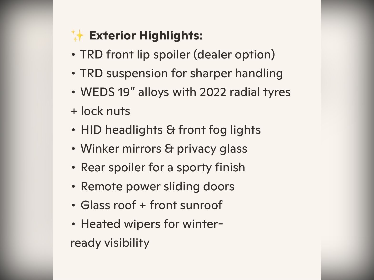 Dealer option TRD front lip spoiler, TRD suspension, WEDS 19” alloy wheels with 2022 radial tyres and lock nuts. HID headlights, front fog lights, winker mirrors, privacy glass, rear spoiler. Glass roof plus front sunroof. Heated wipers. Smart key entry (x2). Metallic black paint (202).