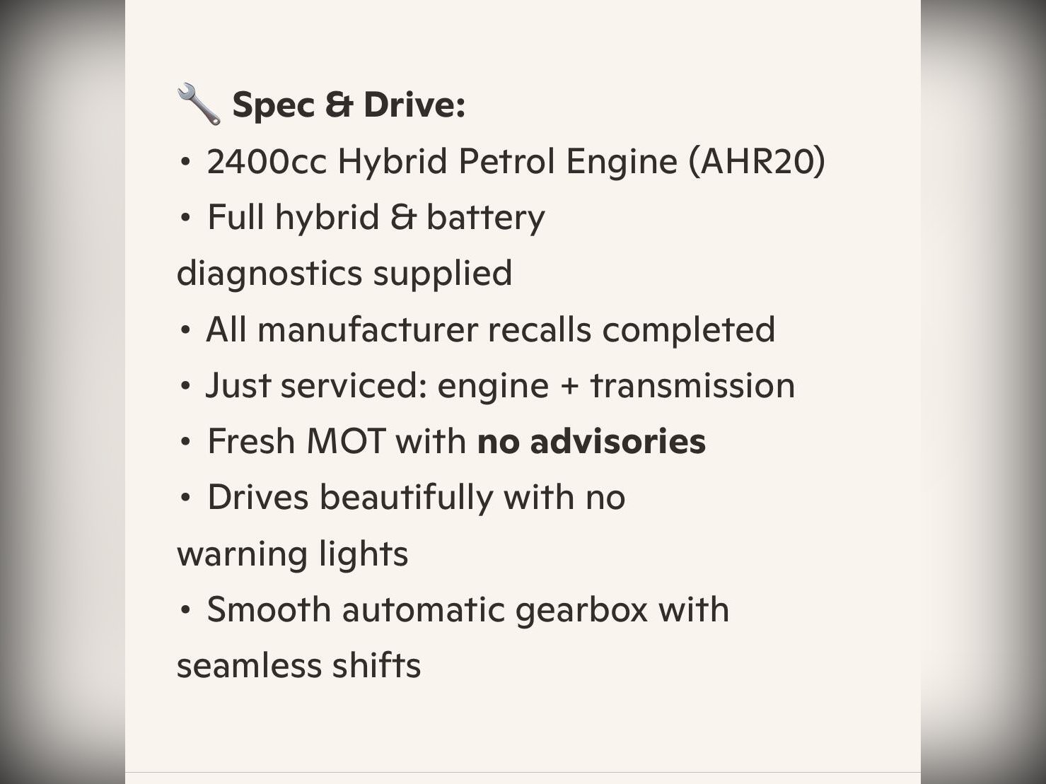 4WD AHR20 hybrid system with diagnostics and battery health reports supplied. All manufacturer recalls completed. Just serviced with engine and transmission service and fresh MOT with no advisories. Drives beautifully with no warning lights after extended test drive. Seamless automatic gearbox.