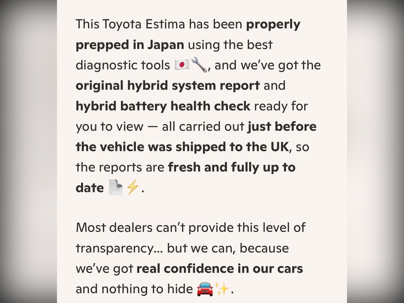 A clear Hybrid System Diagnostic Report is held in our office, confirming the hybrid battery and system are performing exactly as they should. This documentation is rare and adds significant reassurance for long?term ownership.