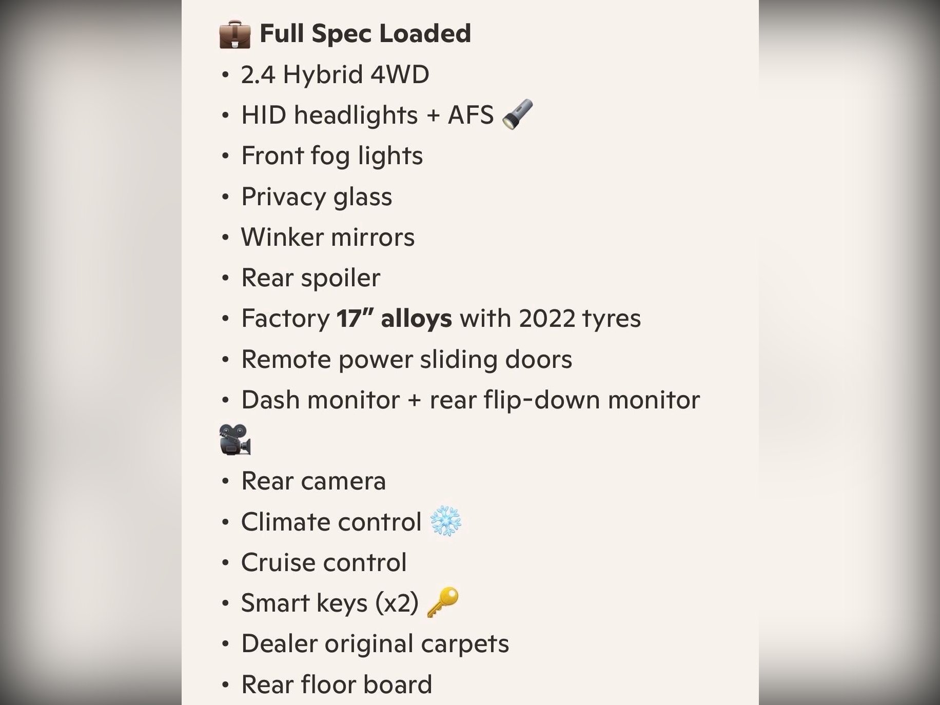 Powered by the proven 2.4 Hybrid 4WD system, this model includes HID headlights with AFS, front fog lights, privacy glass, winker mirrors, rear spoiler, factory 17” alloy wheels with 2022 radial tyres and remote power sliding doors. Interior features include dash monitor + rear flip?down monitor, rear camera, climate control, cruise control, smart keys (x2), dealer original floor carpets, and rear floor board.