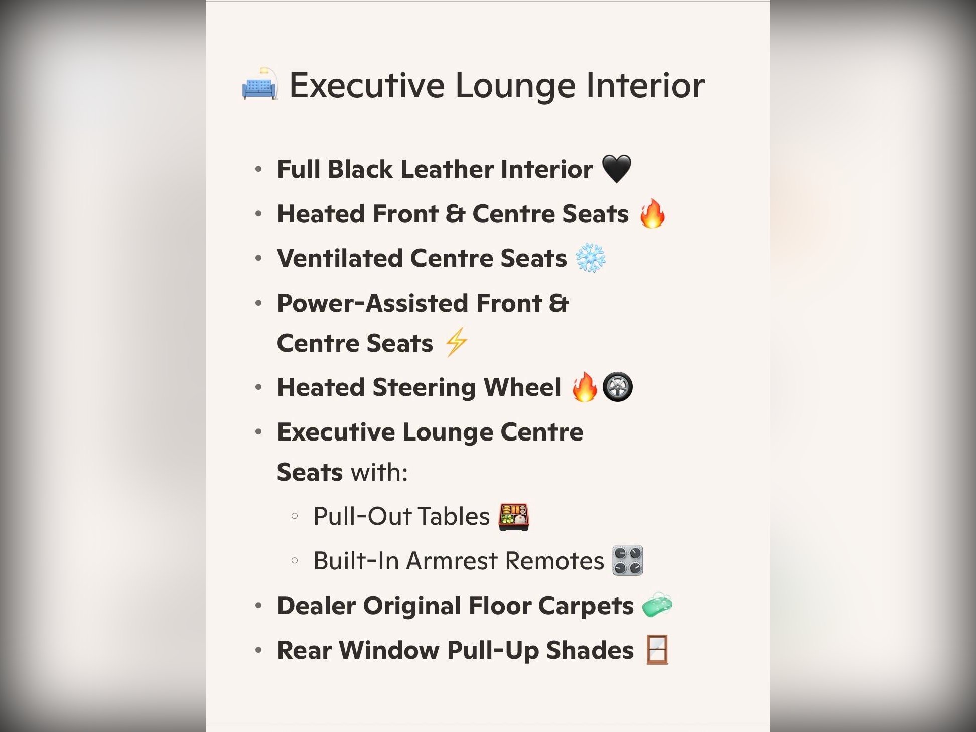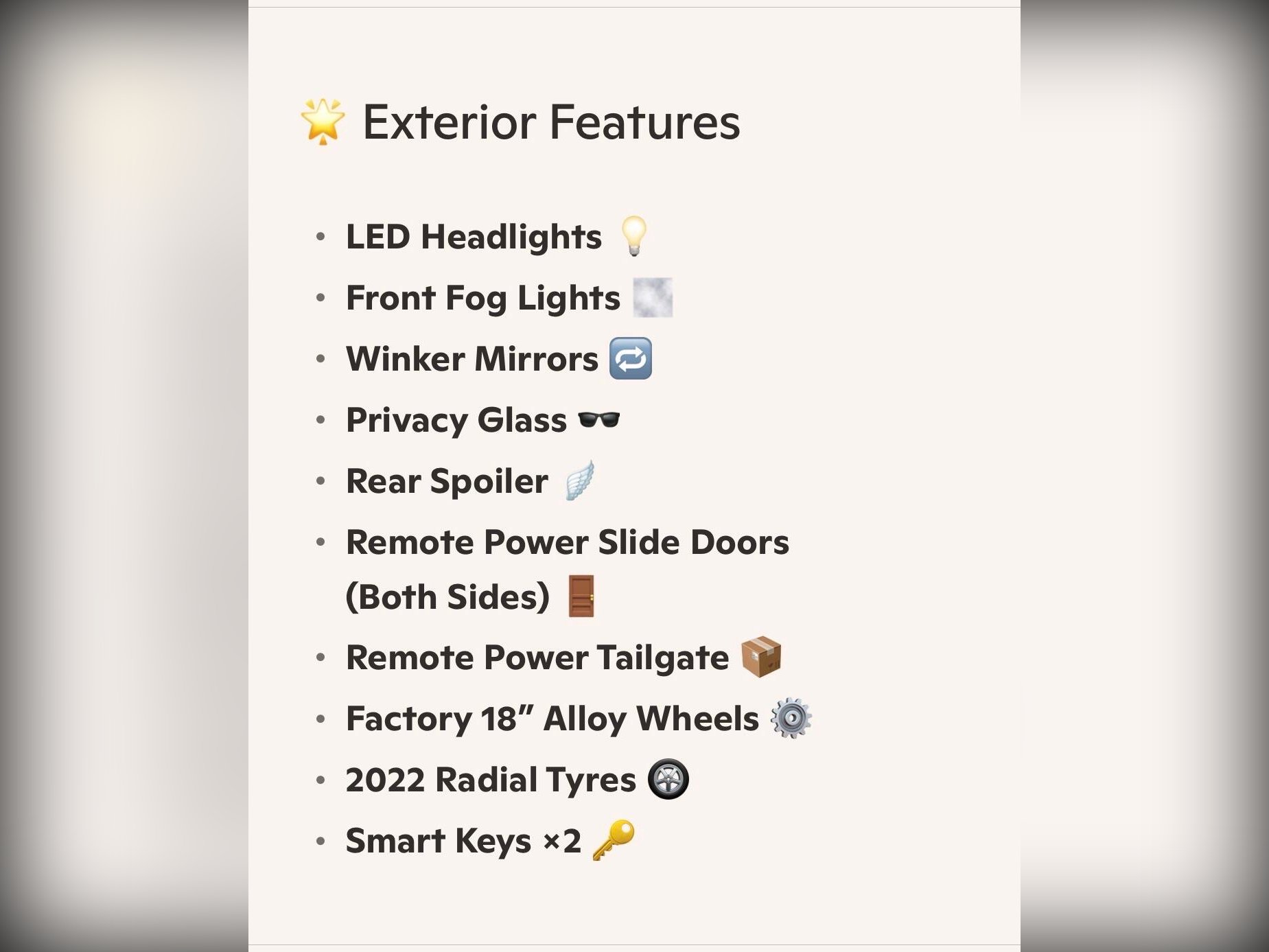 This Executive Lounge model is fully loaded with LED headlights, front fog lights, winker mirrors, privacy glass, rear spoiler, remote power slide doors and remote power tailgate. Factory 18” alloy wheels fitted with 2022 radial tyres. Smart keys ×2.