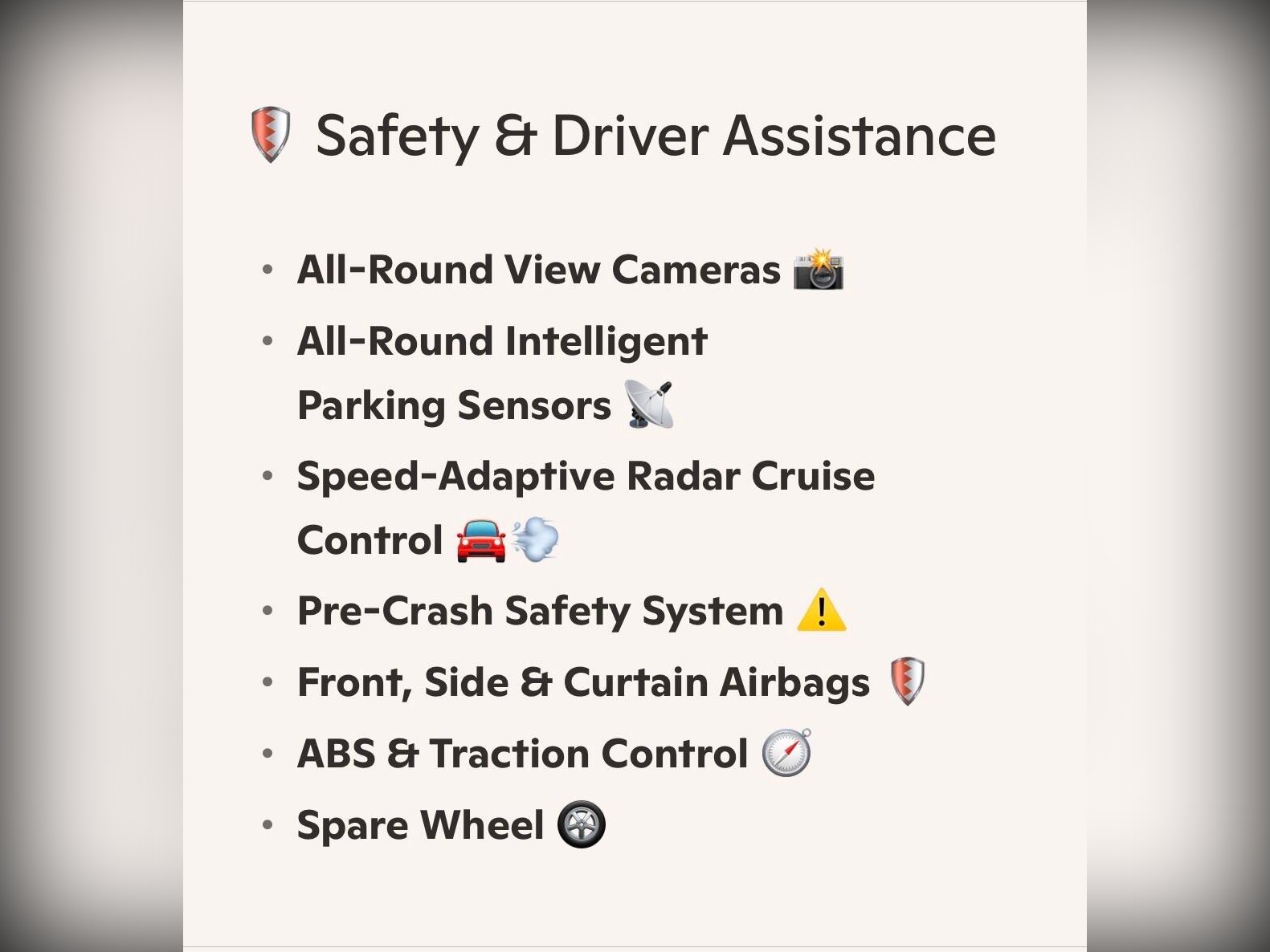 Safety and tech include all?round view cameras, intelligent parking sensors, radar adaptive cruise control, pre?crash system, ABS, traction control, front/side/curtain airbags and spare wheel.