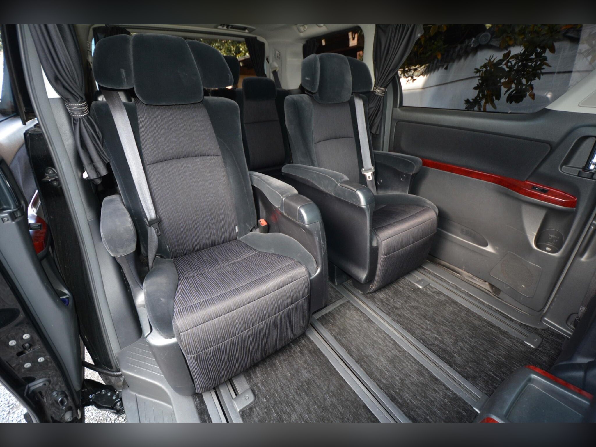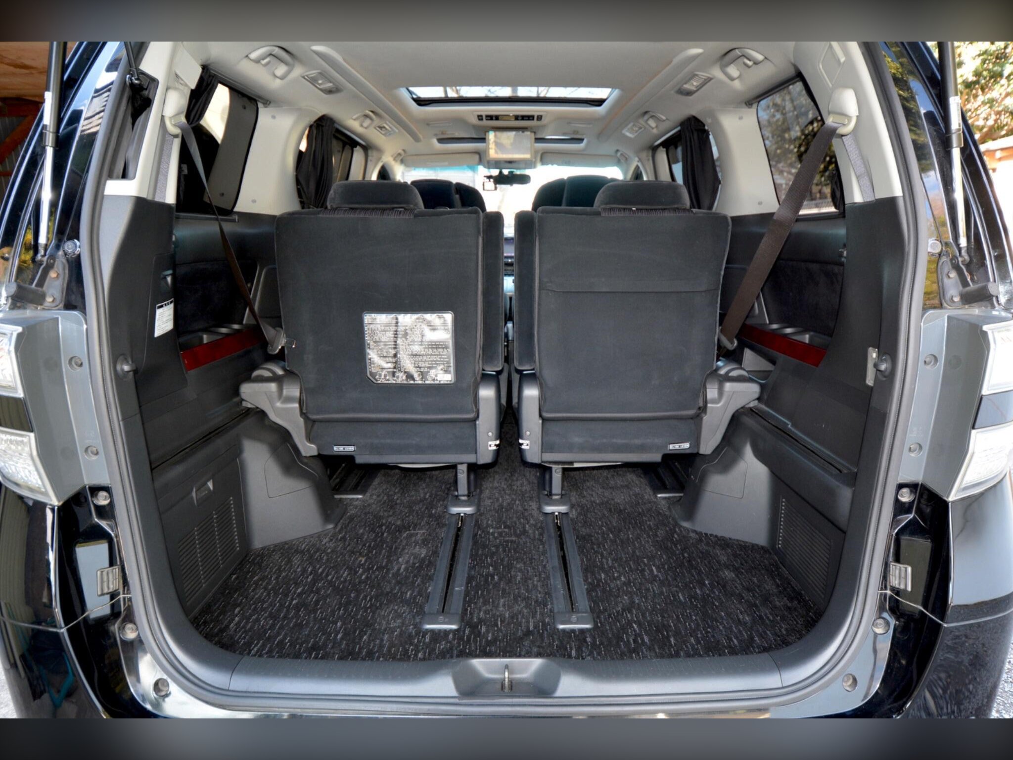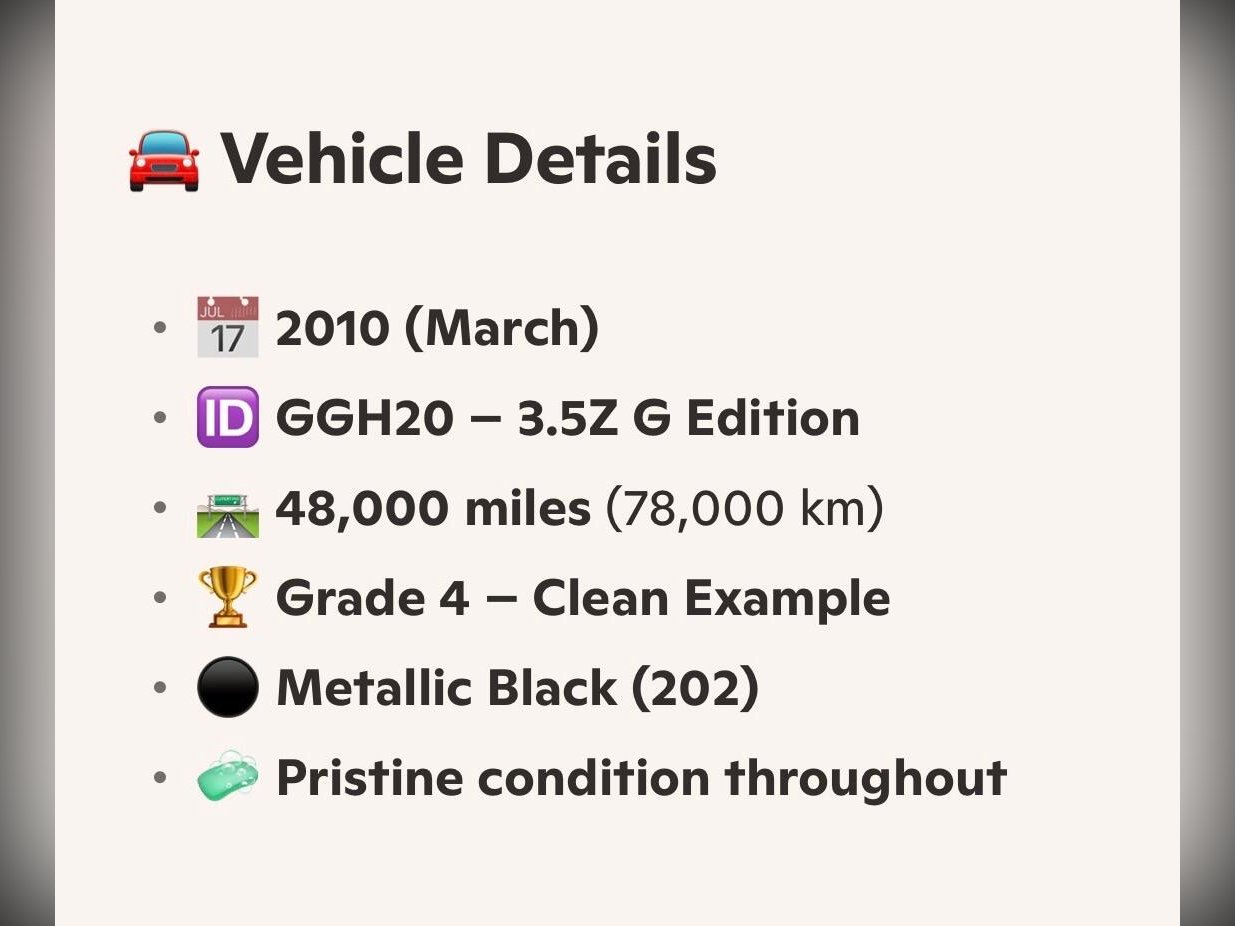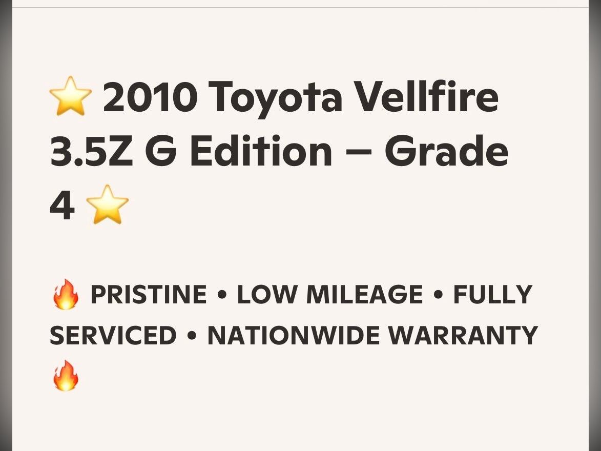 2010 (March) Toyota Vellfire 3.5Z G Edition, model code GGH20, 3500cc V6 automatic finished in metallic black (paint code 202). This is a Grade 4 clean vehicle showing only 48,000 miles or 78,000 kilometres, presented in pristine condition throughout and fully prepared to the highest standards by Wanstead Carriages. Specifications include Xenon headlights with Adaptive Front-lighting System plus HID front fog lights, privacy glass, indicator integrated mirrors with automatic folding function, rear spoiler and twin electric sunroofs. Convenience features consist of remote power sliding doors and power rear gate, factory fitted 18 inch alloy wheels, dashboard display and flip down rear monitors alongside premium sound system with HDD, CD and MD functions all in perfect working order. Inside you will find power adjustable front seats with driver memory position, original dealer floor carpets, dual zone climate control, two smart keys, automatic wipers, cruise control, all round parking sensors and rear parking camera, while front and rear drive recorders are also fitted. Safety is covered by front, side and curtain airbags, ABS and Vehicle Stability Control, with all manufacturer safety recalls completed. This vehicle drives beautifully with responsive power and seamless gear changes, with no warning lights illuminated following comprehensive testing. It has recently passed its MOT with no advisories, had a full engine service and transmission service completed, and undergone a rigorous multi point pre delivery inspection; independent AA or RAC inspections are welcomed. Every purchase includes a full VX and HPI history check confirming no mileage discrepancies or hidden damage, a 12 month Nationwide premier warranty covering over 8,000 mechanical and electrical components including parts and labour, and 12 months AA breakdown cover. As members of AA Cars Standards and approved by the Chartered Trading Standards Institute, we offer complete transparency and peace of mind.
