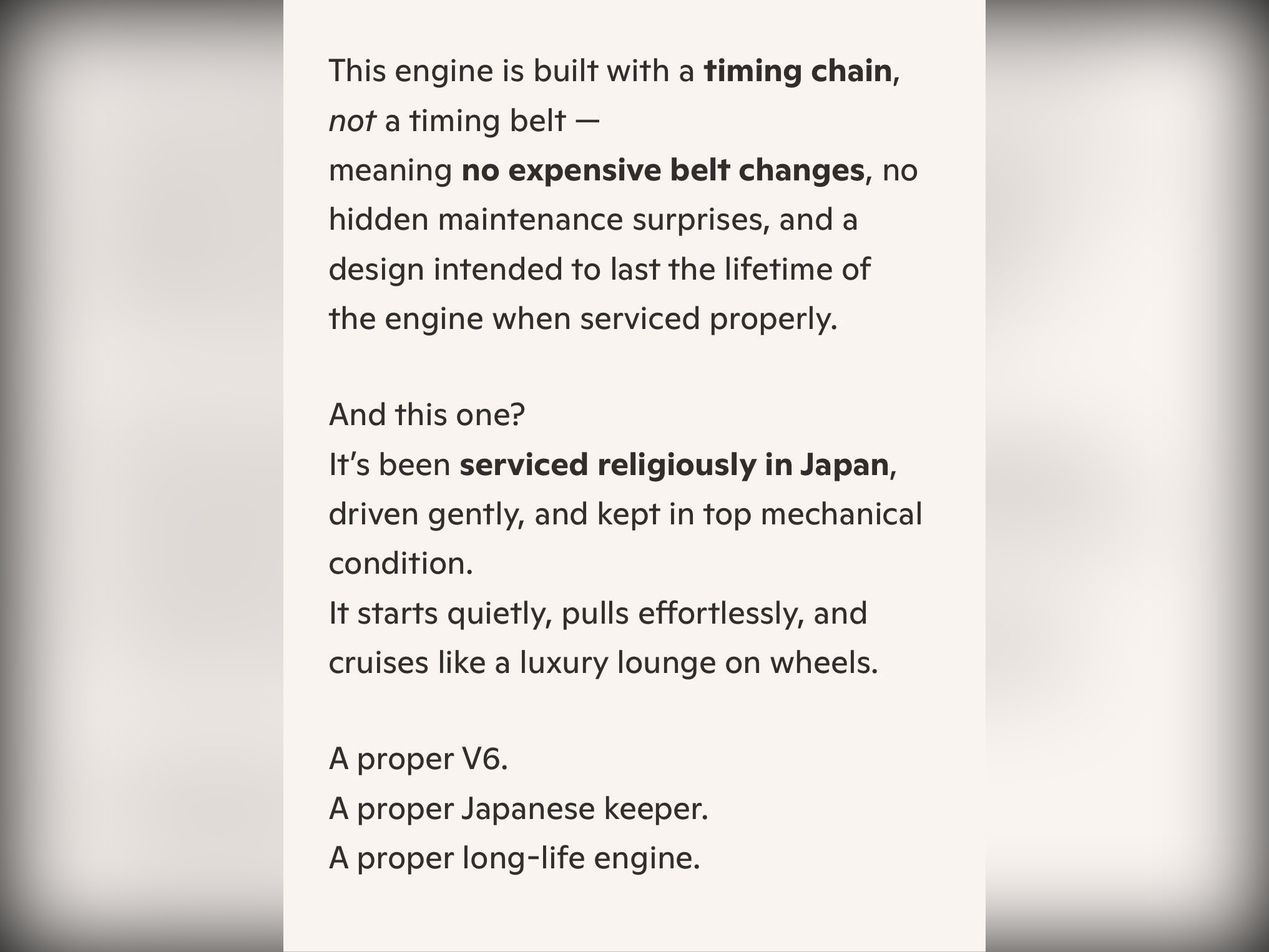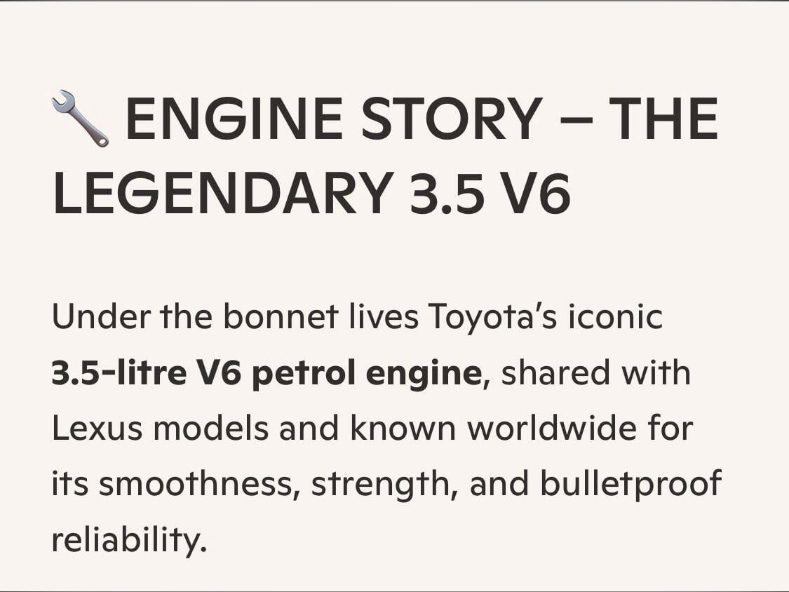Finished in Pearl White (070) and graded TAA Grade 4, the car is clean inside and out, showing just 49,000 miles (78,000 km). Powered by Toyota’s legendary 3.5?litre V6 petrol engine, this model uses a timing chain, not a timing belt, meaning no belt replacement intervals or hidden timing?belt costs. The engine runs smoothly, the gearbox shifts seamlessly, and after extended test drives there are no warning lights and no unwanted noises. It has just received a fresh MOT, engine service, and transmission service, all completed with no advisories.