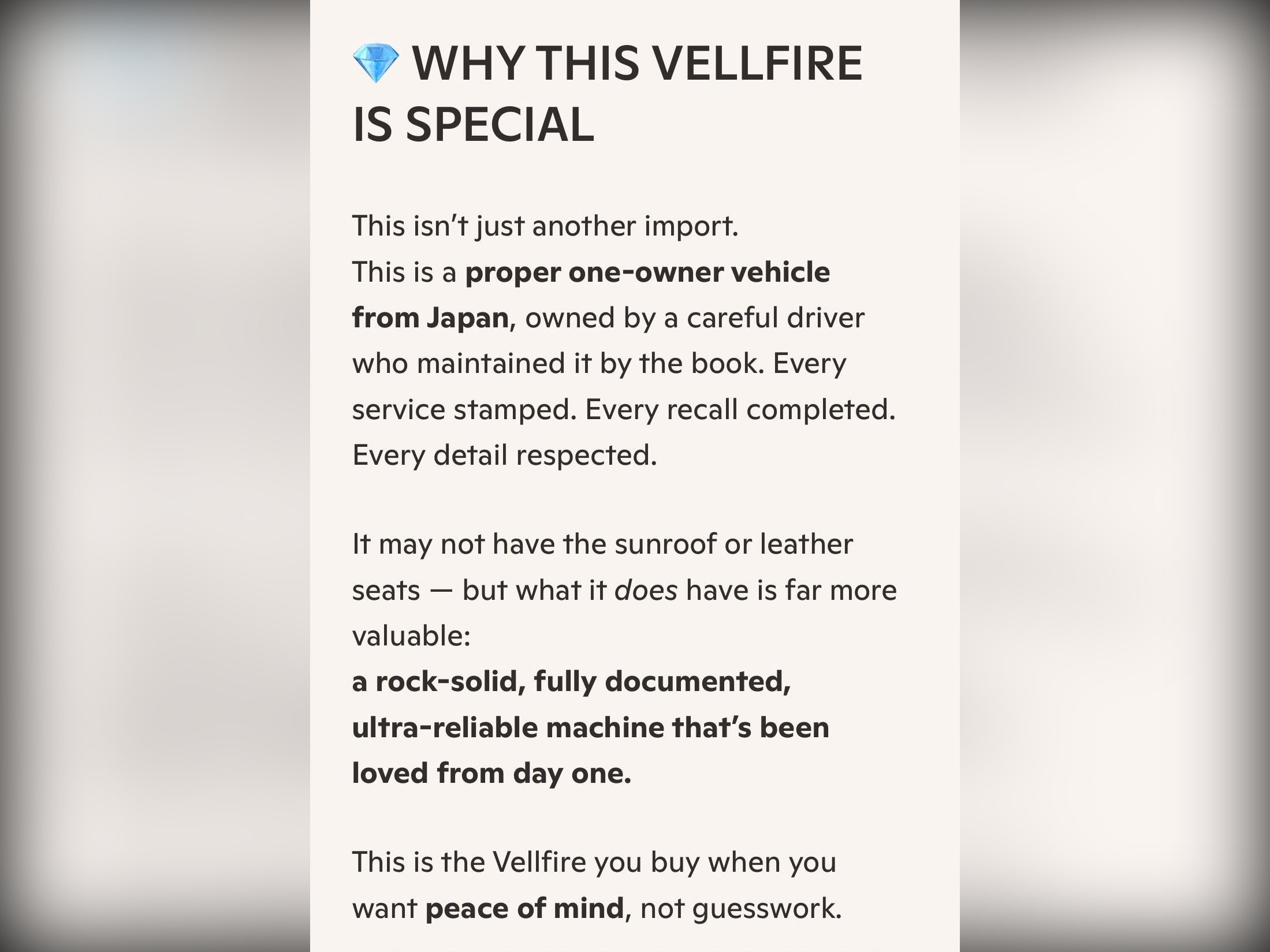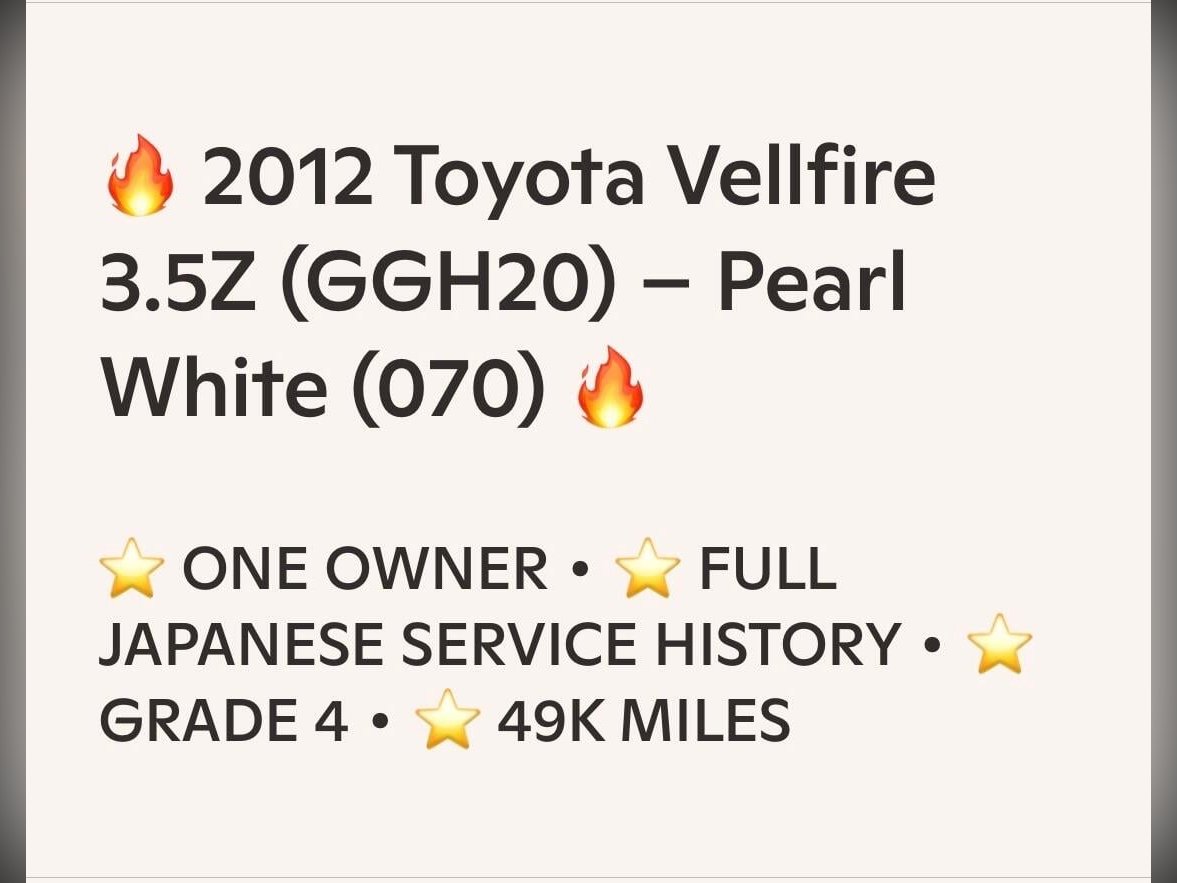 This beautifully presented 2012 Toyota Vellfire 3.5Z has arrived directly from Japan, owned from new by one careful Japanese keeper. In Japan, long?term single ownership is rare and highly respected — it reflects pride, discipline, and meticulous maintenance. This example comes with a full Japanese service history, fully stamped and fully verifiable, proving how well this vehicle has been cared for throughout its life.