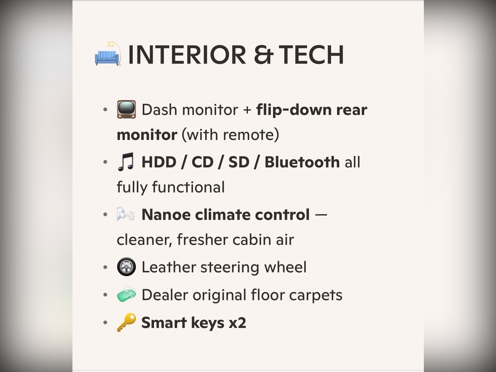 Specification includes: HID headlights with AFS, front fog lights, winker mirrors, privacy glass, rear spoiler, remote power sliding doors, factory 18” alloy wheels with radial tyres, rear camera, all?round parking sensors, dash monitor, flip?down rear monitor with remote, HDD/CD/SD/Bluetooth, Nanoe climate control, leather steering wheel, smart keys (x2), dealer original floor carpets, TRC, ABS, cruise control, and all manufacturer recalls completed.