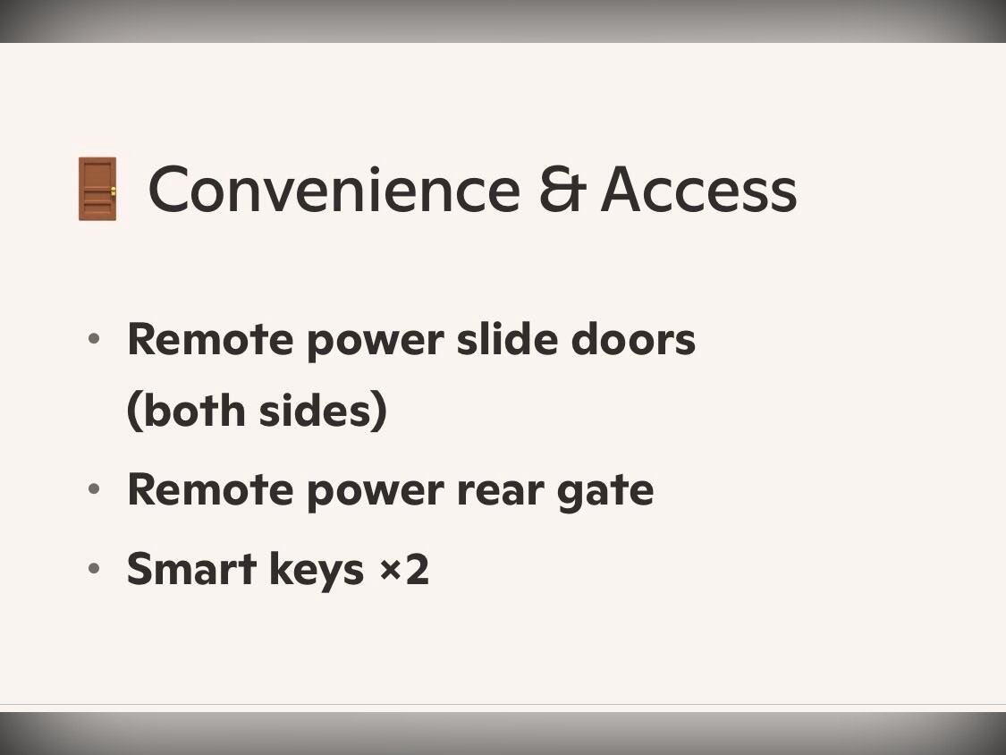 This vehicle is well?specified with front fog lights, HID headlights with AFS, winker mirrors, privacy glass, rear spoiler and remote power slide doors plus remote power tailgate. It also benefits from dealer?option Hi?Gloss 18” alloy wheels fitted with Good radial tyres. Supplied with two smart keys.