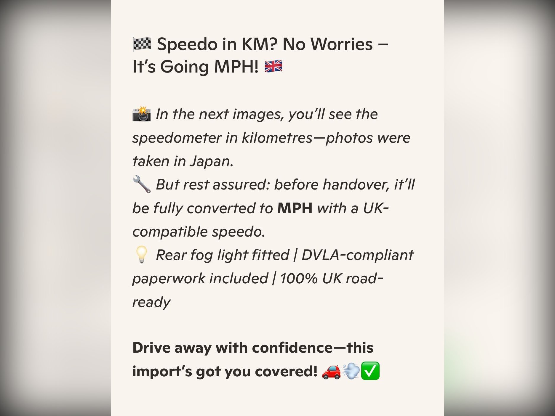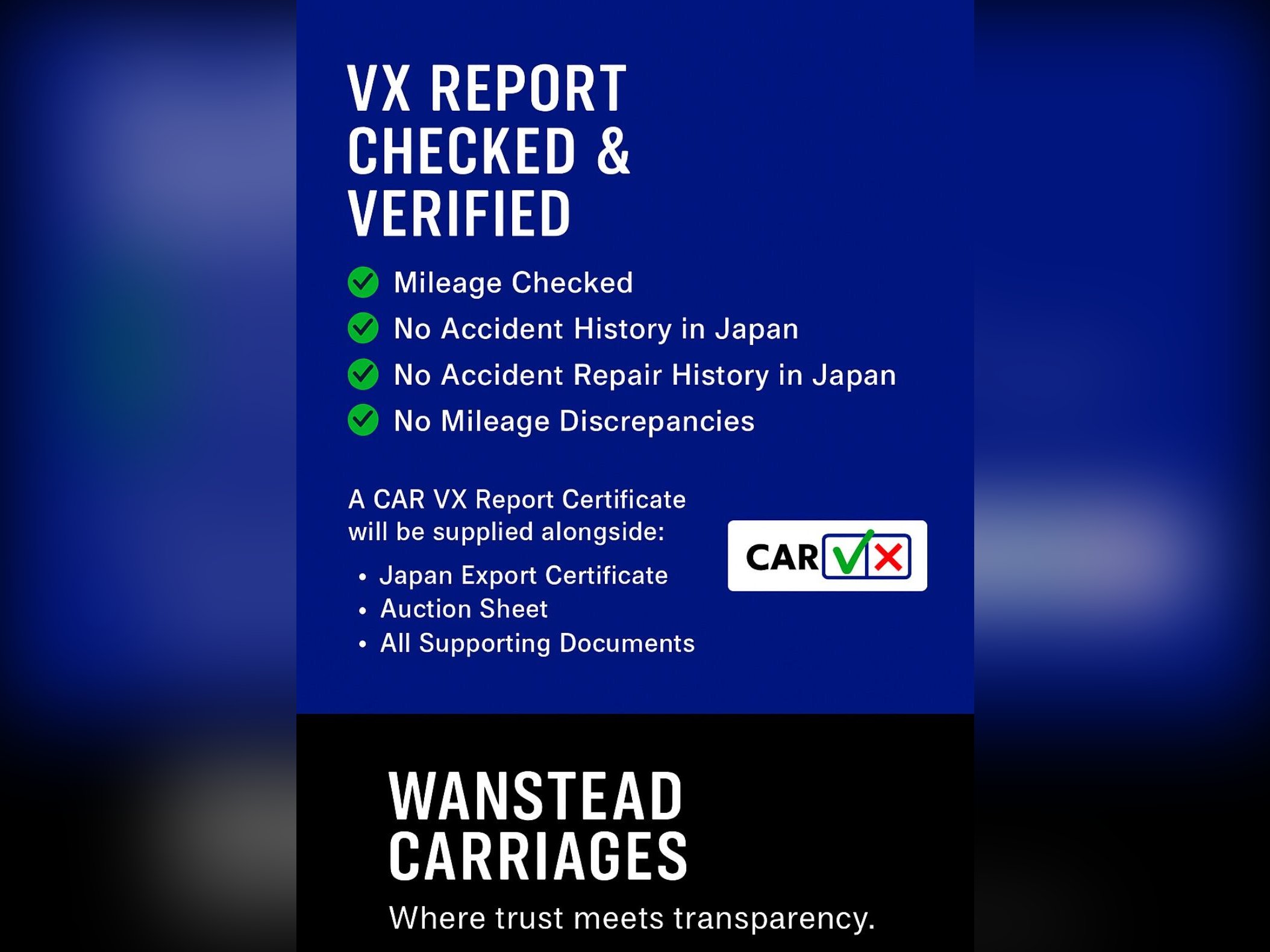 Supplied with a verified VX report (equivalent to UK HPI), confirming no mileage issues or hidden accidents. A printed certificate will be provided.