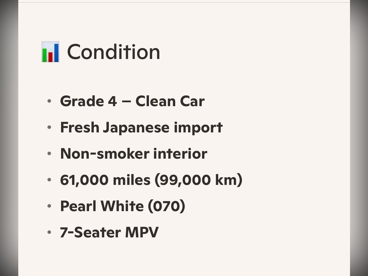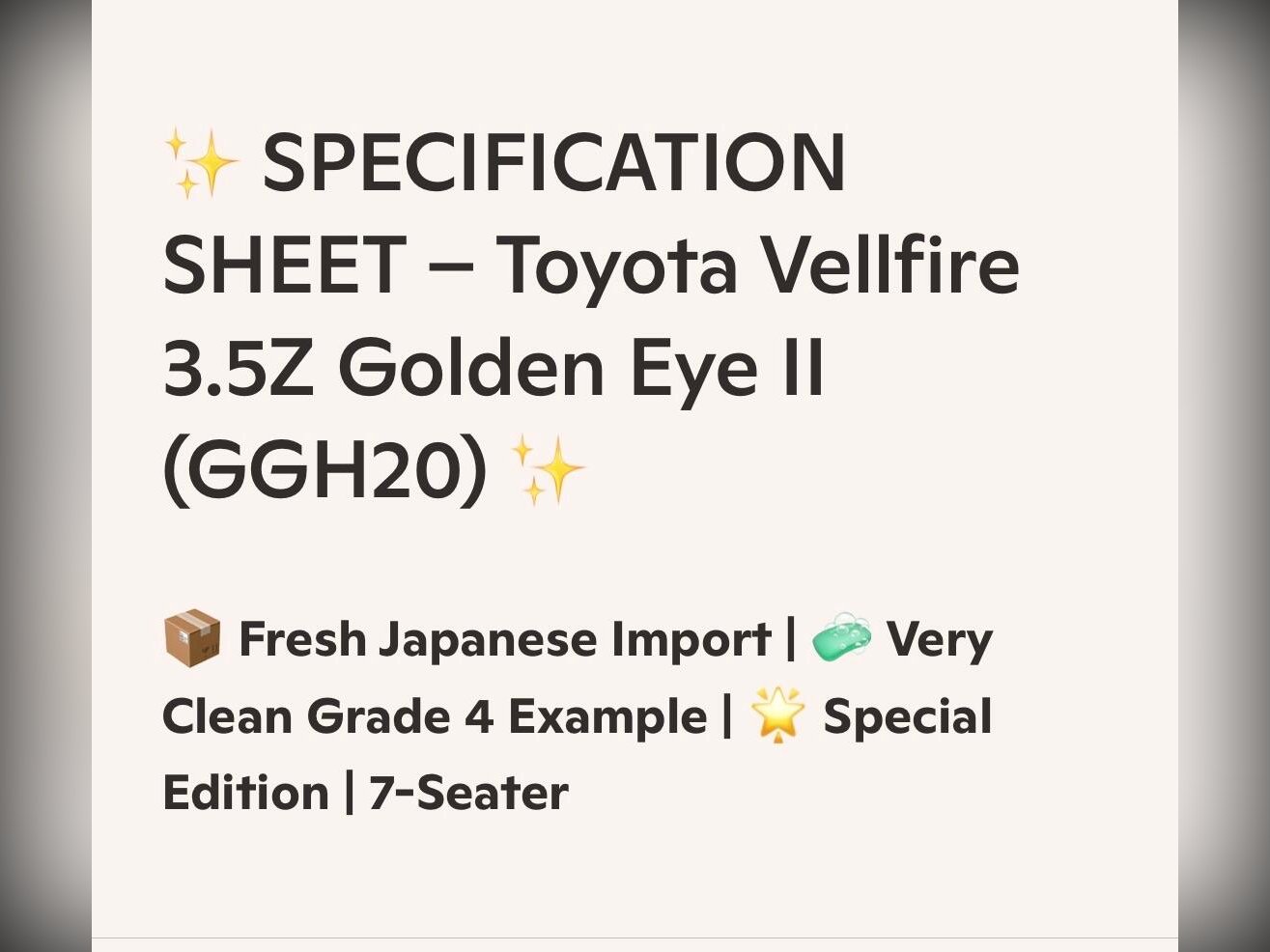 2014 (Nov) Toyota Vellfire 3.5Z Golden Eye II finished in Pearl White (070). A clean Grade 4 example with just 61,000 miles (99,000 km) and a non?smoker interior. Powered by the smooth 3.5 V6 automatic, this Golden Eye II delivers refined comfort, strong performance and excellent reliability.