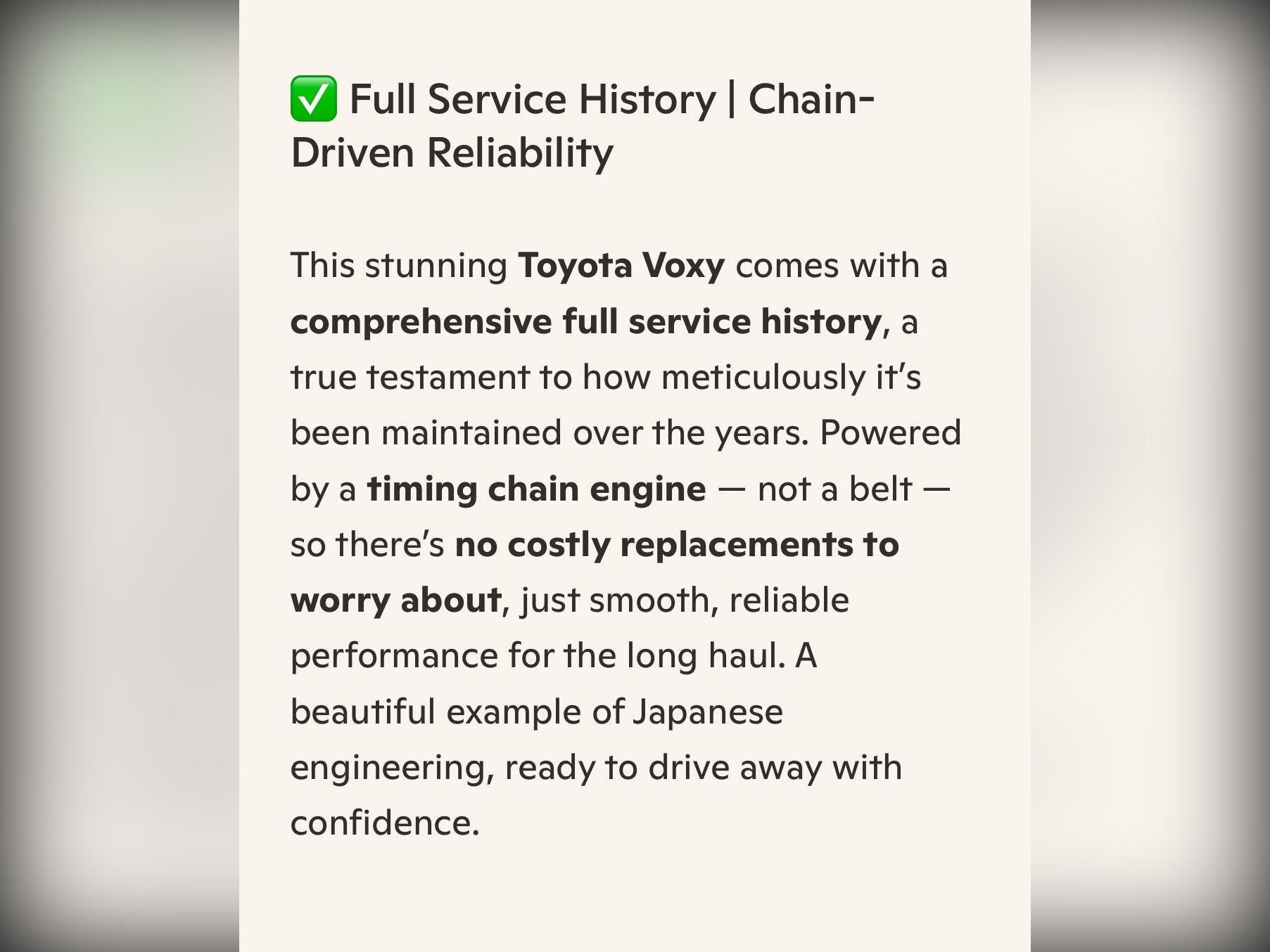 This Voxy comes with a verified VX report (equivalent to a UK HPI check), confirming no mileage discrepancies or hidden accident history. A certificate will be provided. The price includes a 12-month nationwide comprehensive PREMIER warranty from a leading UK provider, covering over 8,000 mechanical and electrical components including parts and labour. Also included is 12 months AA breakdown cover. Every vehicle from Wanstead Carriages undergoes a rigorous multi-point pre-delivery inspection. AA and RAC inspections are welcome. We are proud to be part of the AA Cars Standards, approved by the Chartered Trading Standards Institute. Buy with confidence.