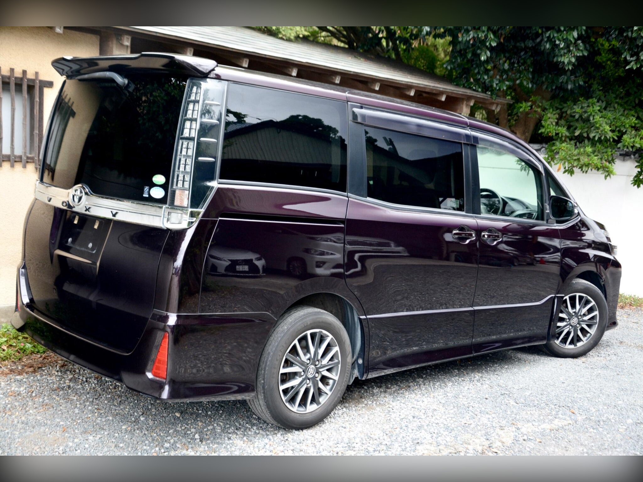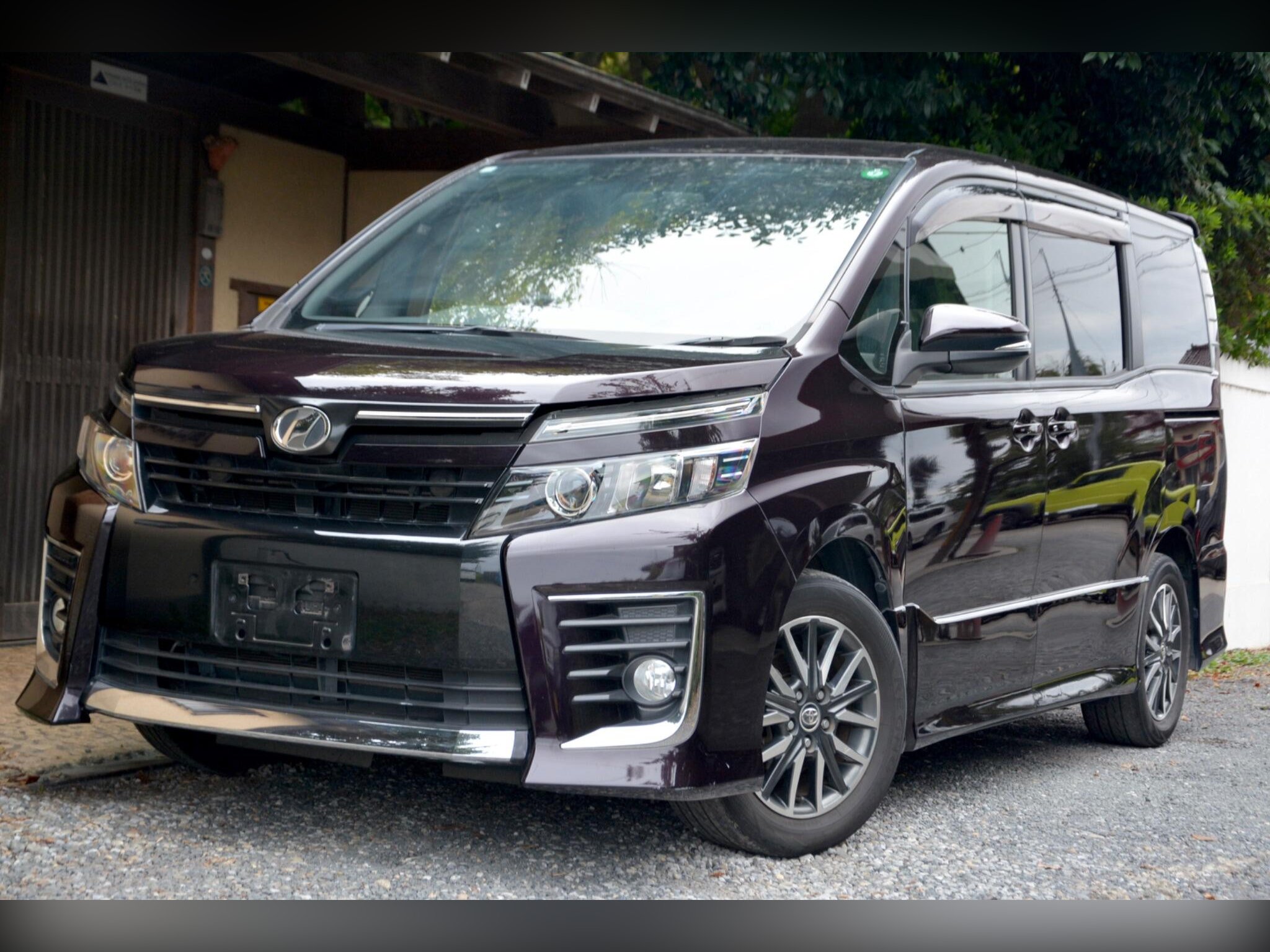 This is a December 2014 Toyota Voxy ZS (ZRR80) 2.0 petrol automatic, a Grade 4 one-owner example with 72,000 miles (115,000 km) and full Japanese service history. Finished in Deep Purple (colour code 3R9), it features front fog lights, LED headlights, winker mirrors, privacy glass, and a rear spoiler. The vehicle is equipped with factory standard 16-inch alloy wheels, remote power sliding doors with integrated pull-up sunshades, and a rear camera for added convenience.